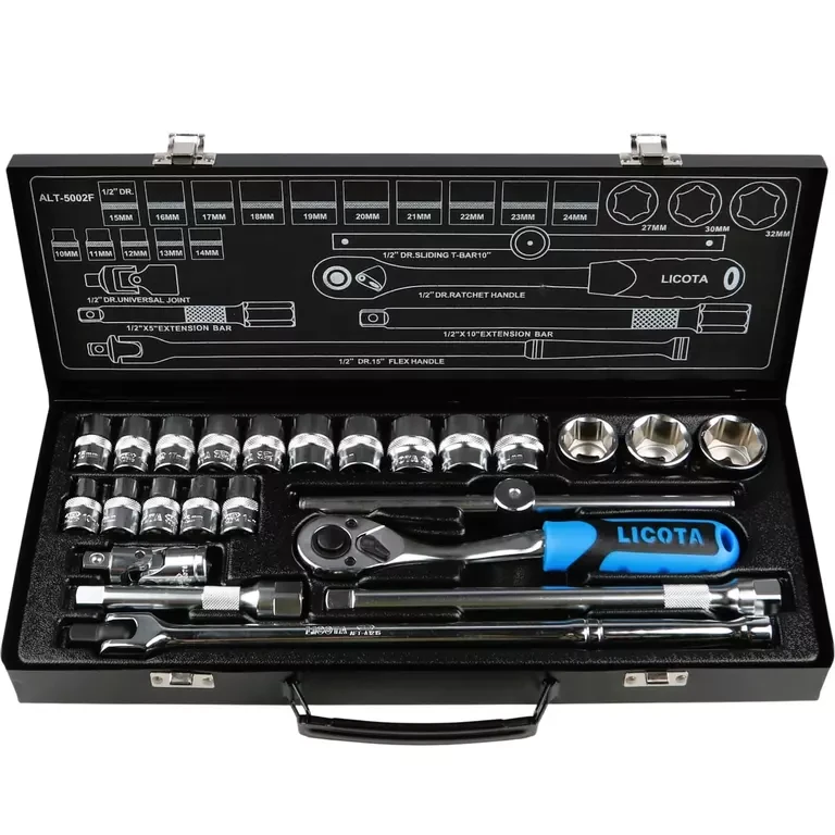Набор торцевых головок 1/2" 24пр. 10 - 32 мм Licota ALT-5002F-RU позволяет производить слесарные, монтажные, демонтажные и ремонтные работы с крепежными соединениями. Трещотка с большим количеством зубьев и мелким шагом перещелкивания обеспечивает плотную фиксацию на профиле детали, что исключает срыв резьбы. Рукоятки инструментов комфортно лежат в руке. Рабочие части выполнены из высококачественной хромованадиевой стали. Набор предоставляется в прочном металлическом кейсе.