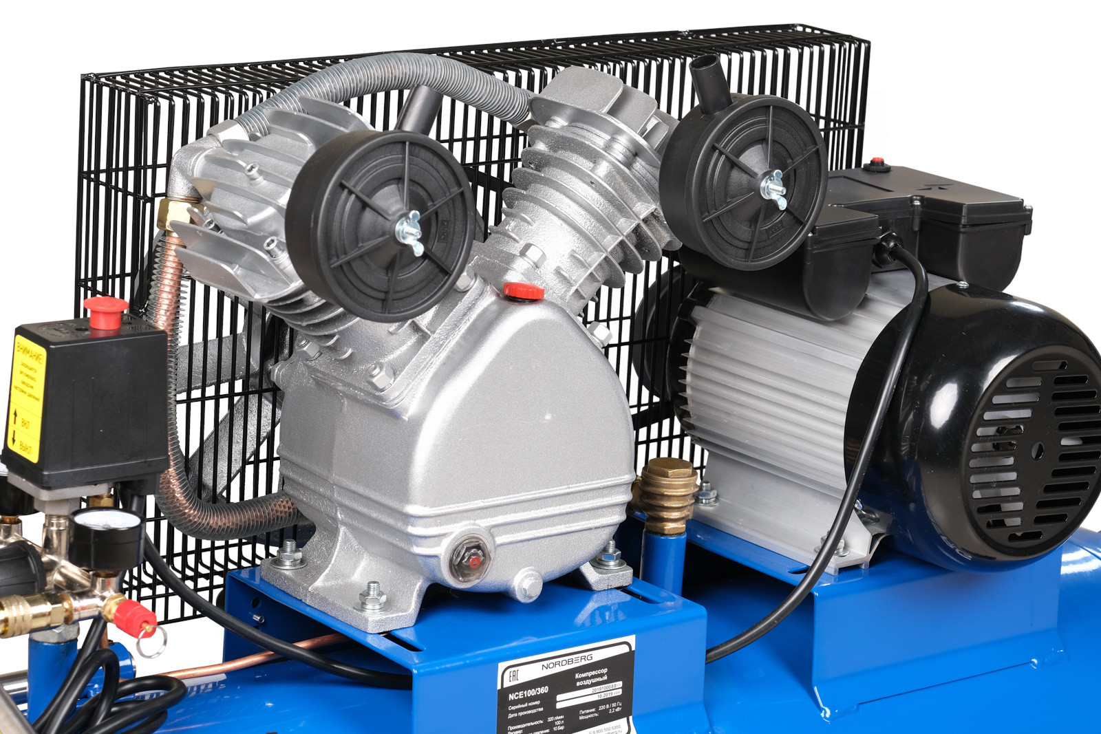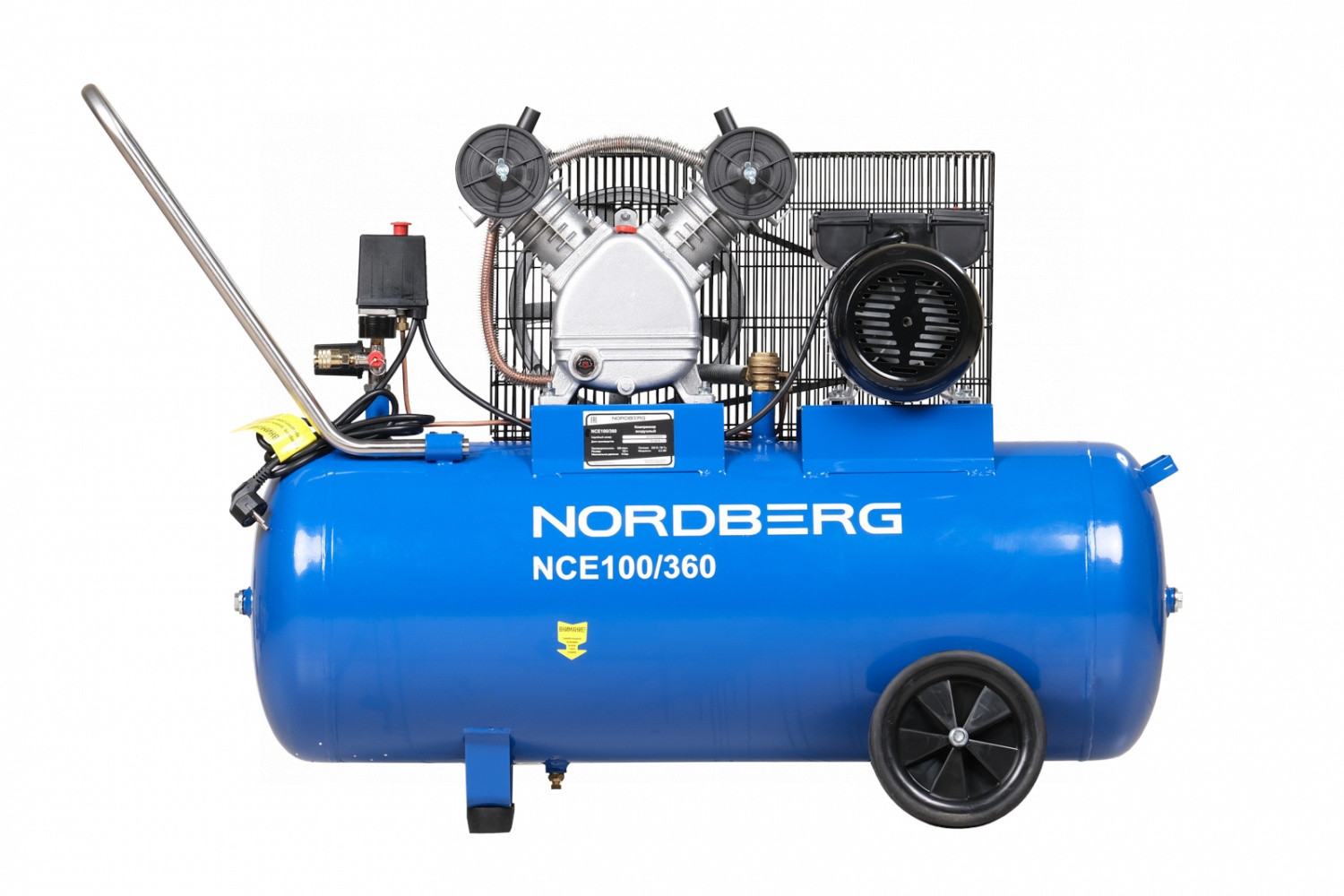 Поршневой компрессор с ременным приводом NORDBERG NCE100/360 – промышленное оборудование для применения с пневмоинструментами в автосервисных мастерских и для использования в бытовых целях.