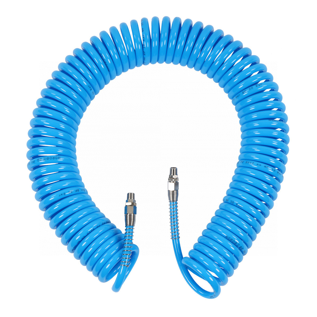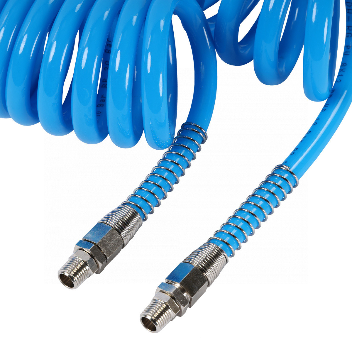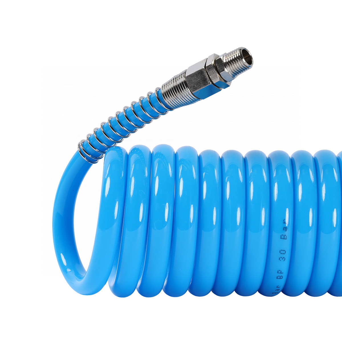 Изготовленный из прочного полиуретана, шланг демонстрирует отличную устойчивость к износу и растяжению. Это существенно увеличивает срок его службы даже при интенсивном использовании в различных условиях. Рабочее давление в 10 бар обеспечивает совместимость с широким спектром пневматических инструментов. Спиральная форма не только предотвращает запутывание во время работы, но и способствует компактному хранению. Шланг оснащен стандартными фитингами с резьбой 1/4", что позволяет быстро подключать его к большинству компрессоров и пневмоинструментов без дополнительных переходников.