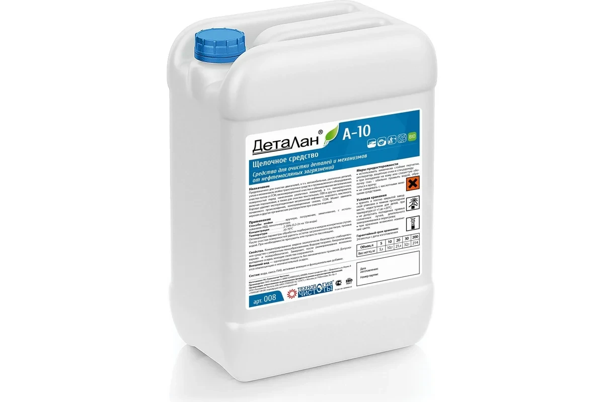 Моющее средство для деталей Деталан А-10 10 л предназначено для удаления консервационных смазок, СОЖ, эксплуатационных загрязнений нефтяного, жирового, масляного, почвенного происхождения, пыли, копоти с металлических и других щелочестойких поверхностей различными методами очистки: вручную или с использованием специальных моечных машин и аппаратов.