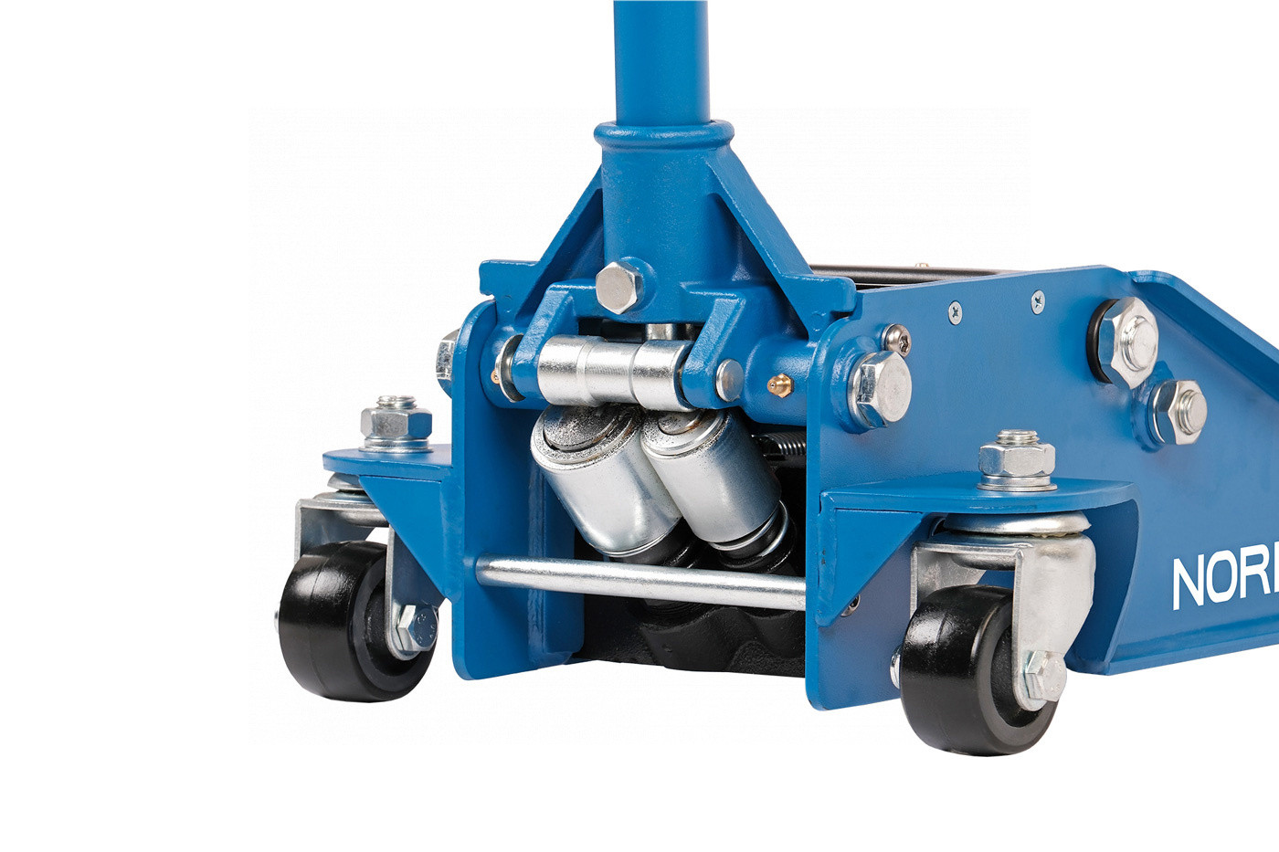 - Маневренность: конструкция с поворотными колесами обеспечивает легкое перемещение домкрата по рабочей площадке и удобное подкатывание под автомобиль.