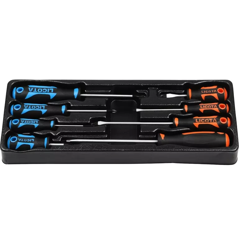 Набор профессиональных отверток Licota ACK-384014 из 8 предметов в ложементе. В комплект входят 4 отвертки с профилем SL (шлиц) и 4 отвертки с профилем PH (крест). Набор предназначен для ручных ремонтно-монтажных работ с самыми распространенными типами крепежа.