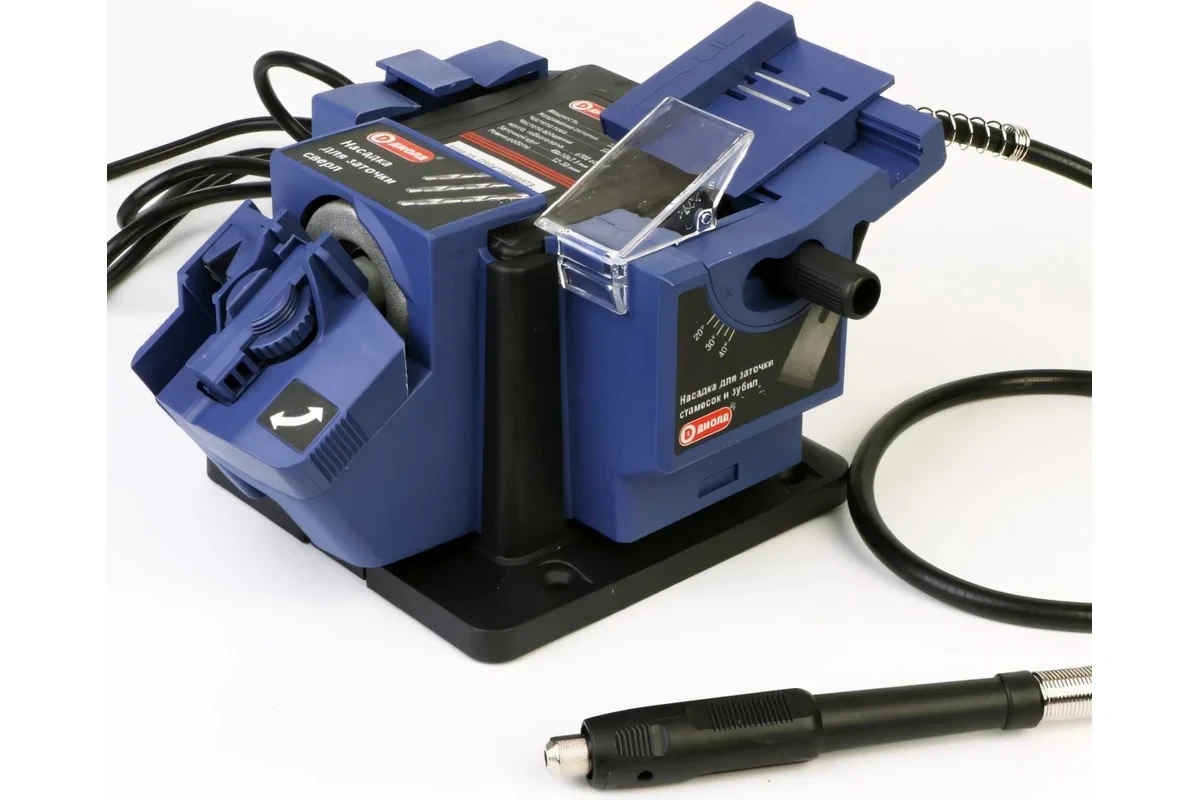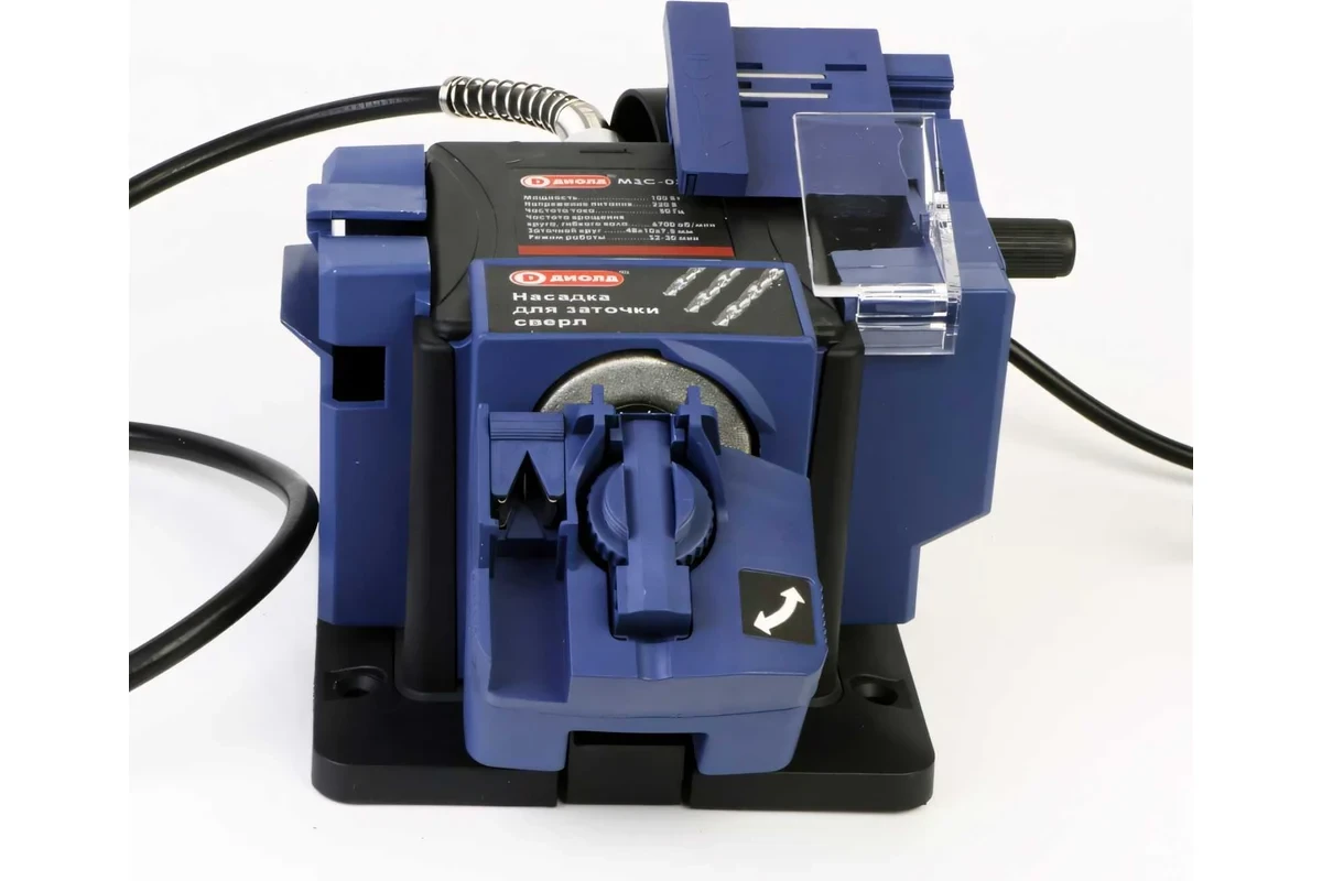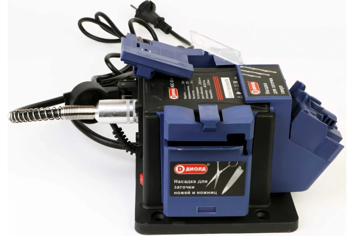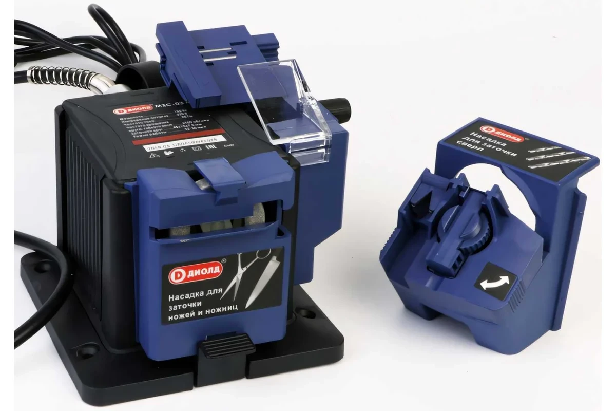Машина ДИОЛД МЗС-03М бытового назначения является многофункциональной машиной (т.е. в ней предусмотрена возможность установки разных видов насадок) и предназначена для заточки сверл по металлу, стамесок, зубил, ножей, ножниц или узких лезвий (в зависимости от используемой насадки).
