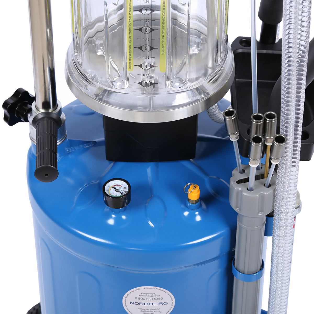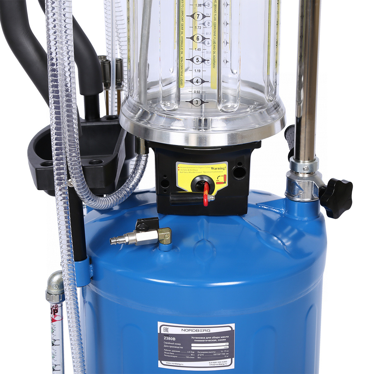 Установка для замены масла NORDBERG (2380) 2380B удаляет отработанное масло и другие жидкости из любого транспортного средства при помощи вентури-вакуумной вытяжной системы.