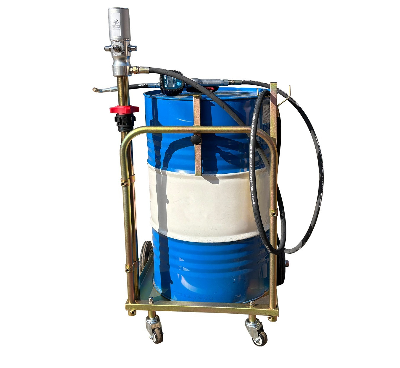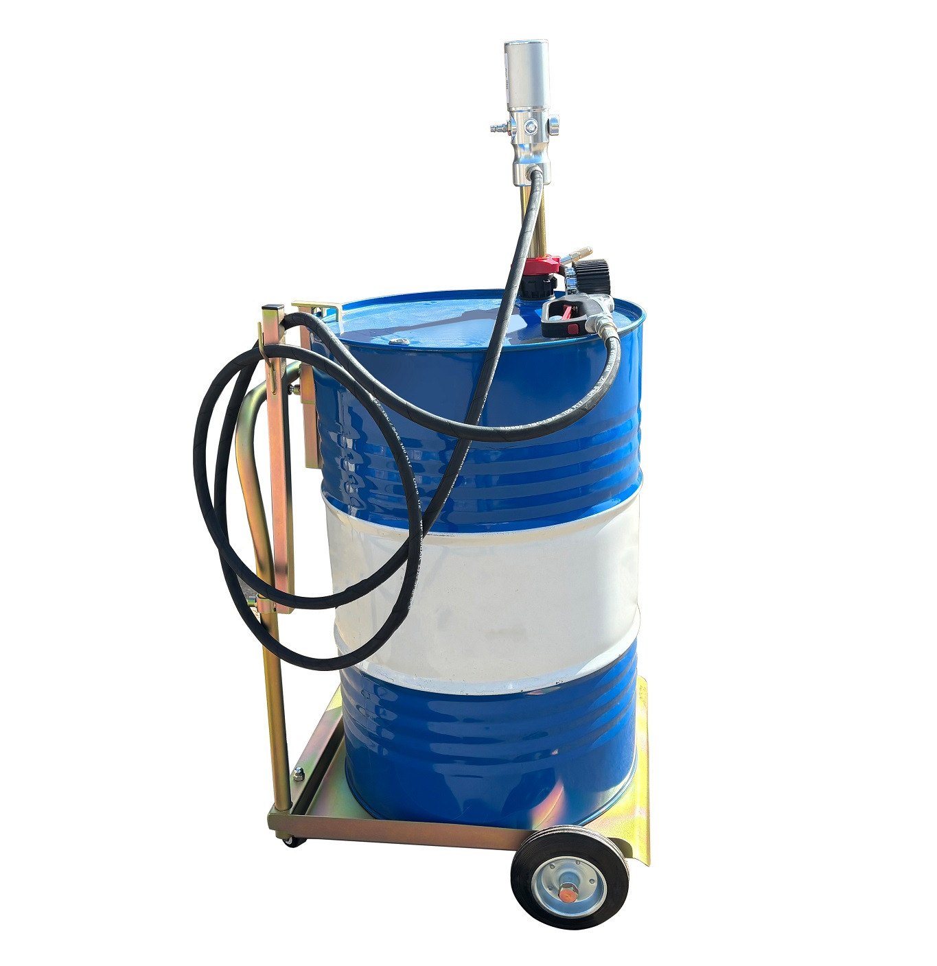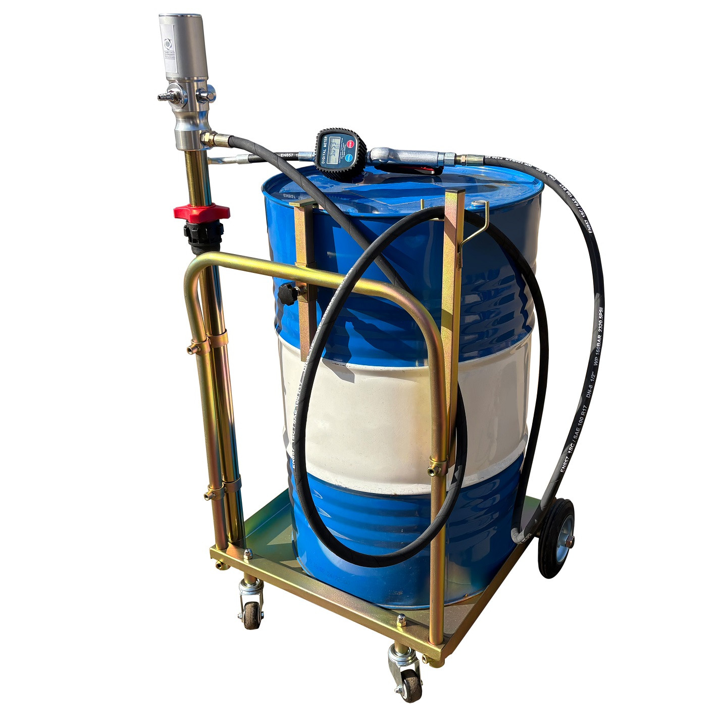 Гарантия 2 года. Комплект для раздачи масла, ATF. Для бочек 180-200л. Комплект: пневматический насос для масла 3:1 производительность 18л/мин h=940мм + шланг маслобензостойкий 4 м. + электронный раздаточный пистолет с гибким наконечником и отсечкой (исключает течь масла после остановки насоса) + подкатная тележка ( 2 прямых + 2 поворотных колеса). Масса: 33,5 кг.