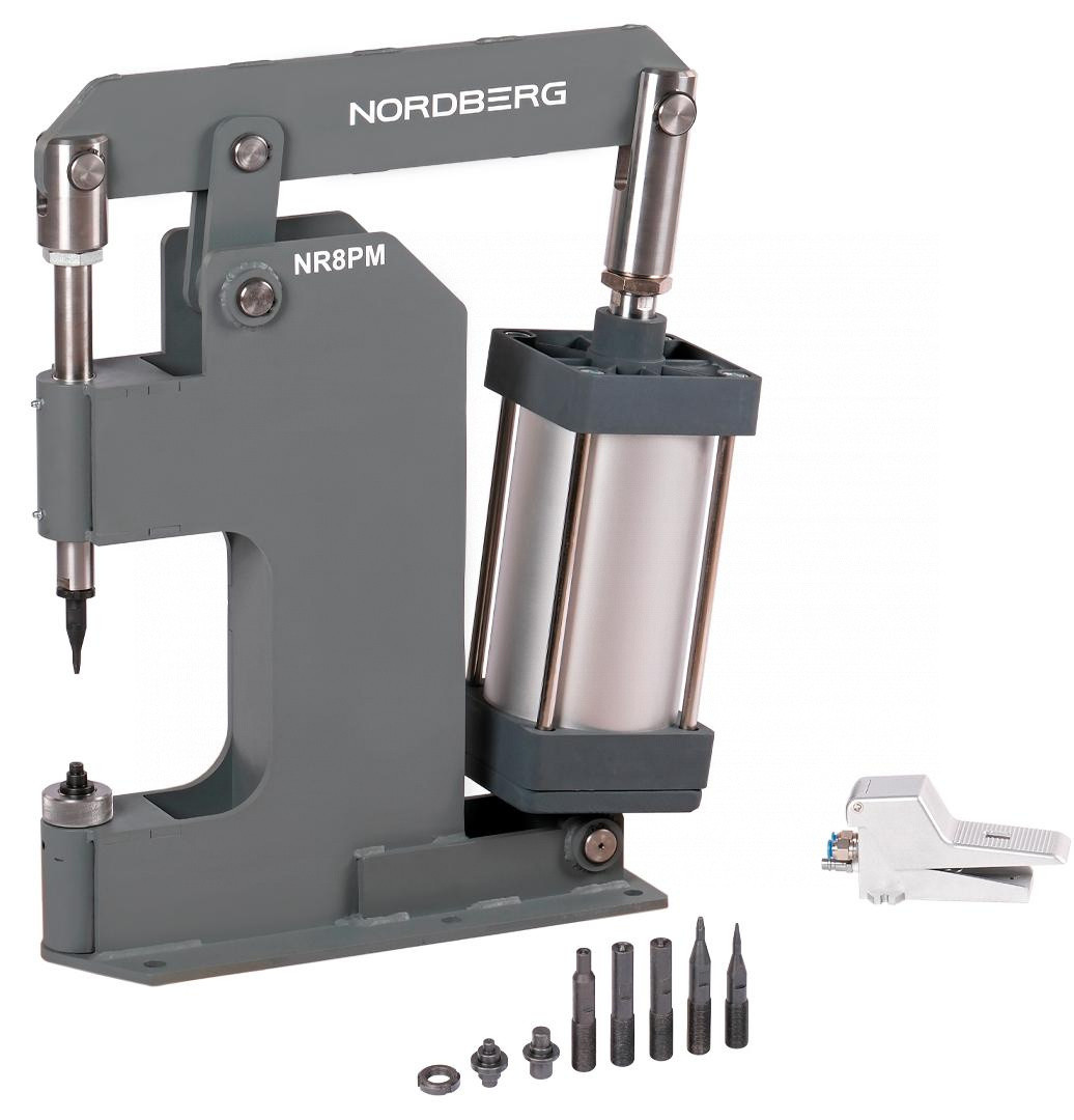 Пневматический станок NR8PM предназначен для установки и удаления заклепок на легковых, грузовых автомобилях и спецтехники. Используется при замене накладок тормозных колодок и дисков сцепления, цилиндр 160мм позволяет работать с заклепками диаметром до 12 мм.