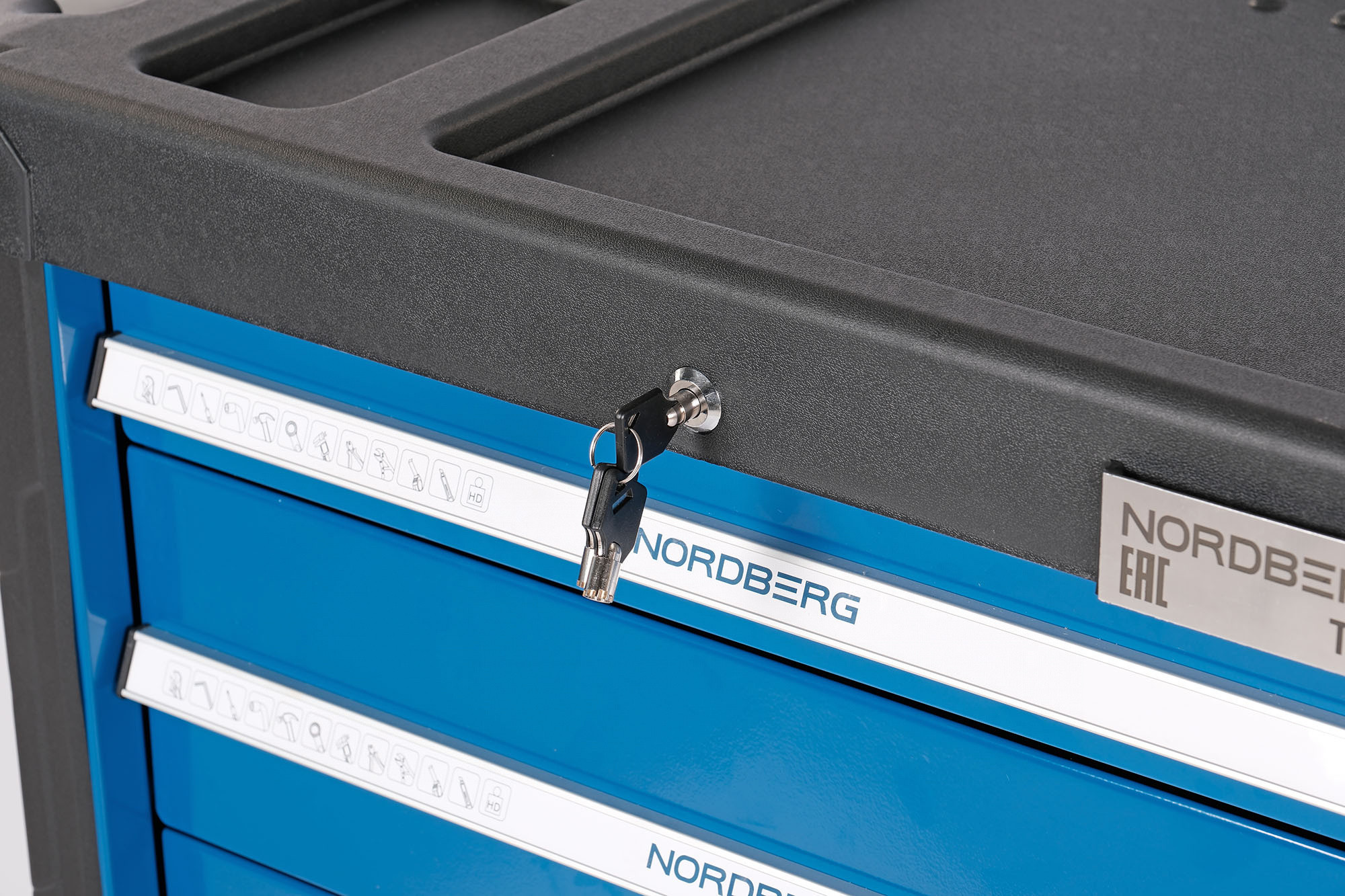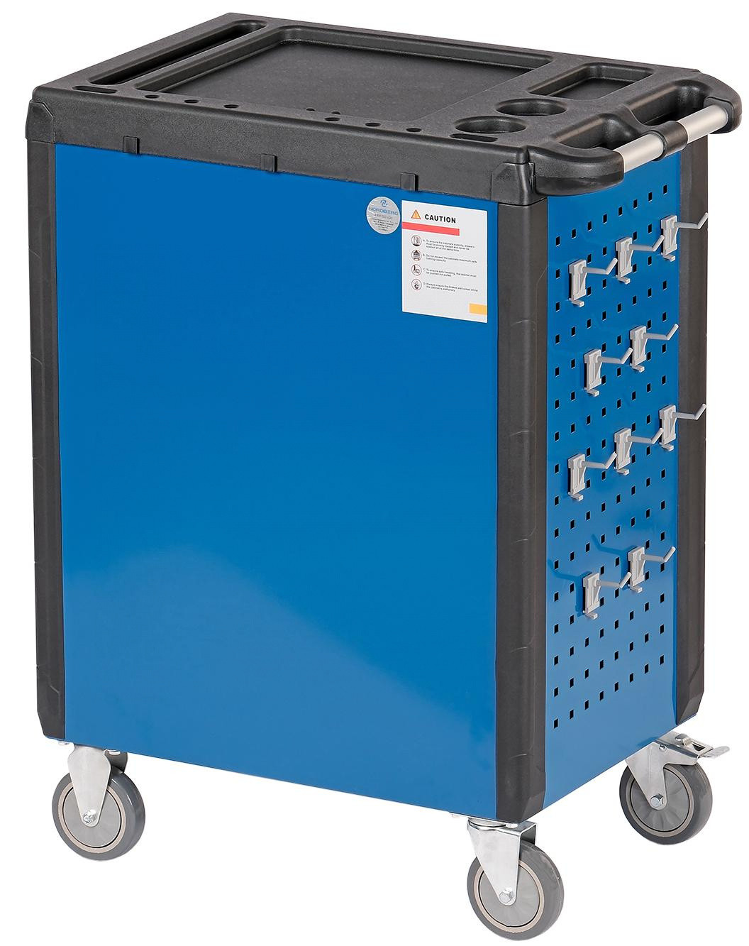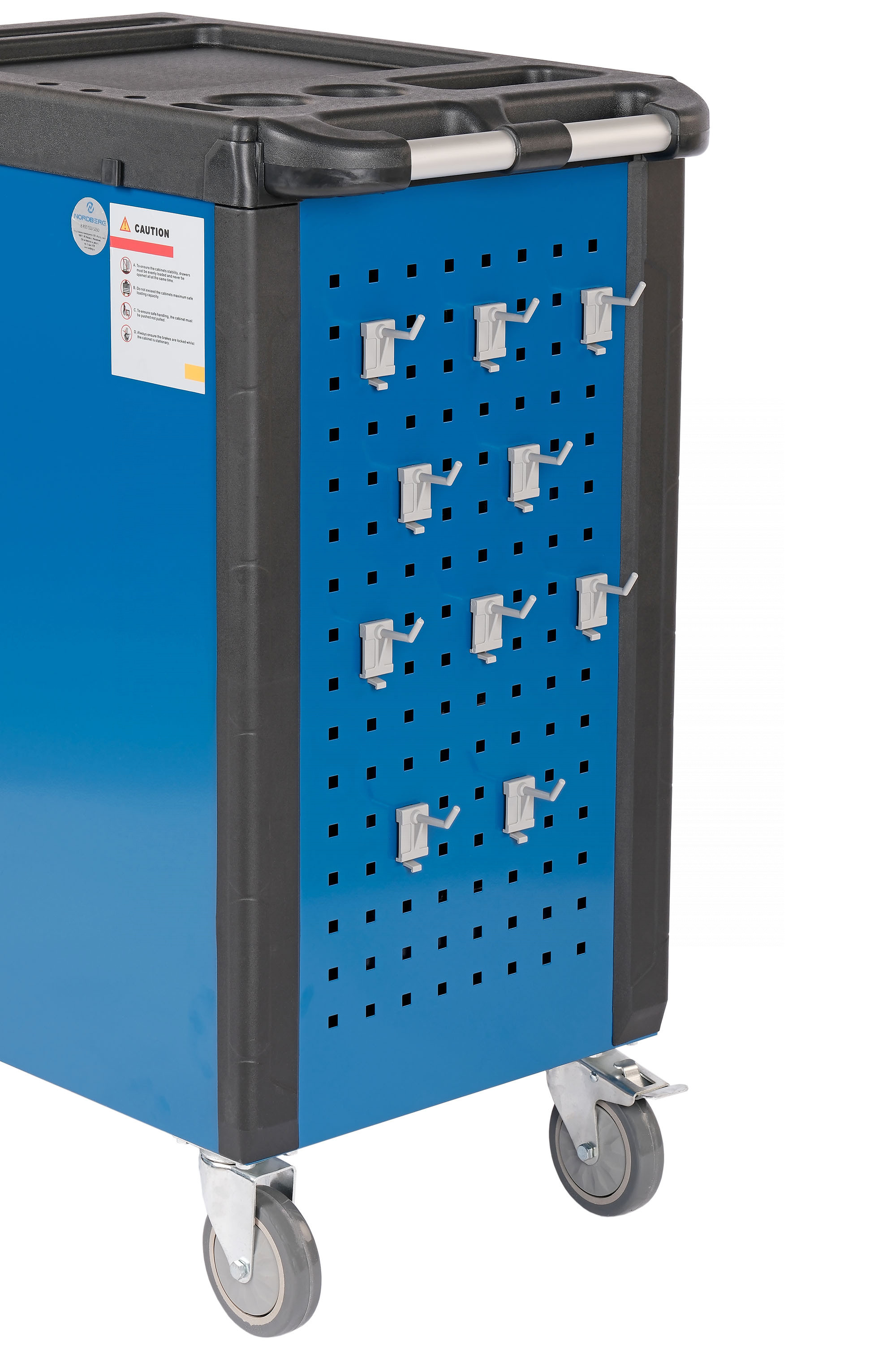 • Одна из боковых стенок тележки имеет перфорированную панель для крепления на ней крючков для инструмента. Крючки идут в комплекте с тележкой.