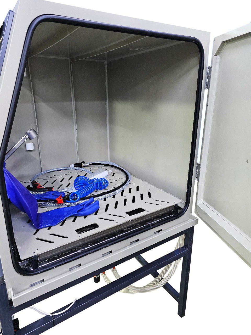 Работает с четырьмя видами абразива: стеклошарик, кварцевый песок, электрокорунд, дробь из нержавеющей стали.