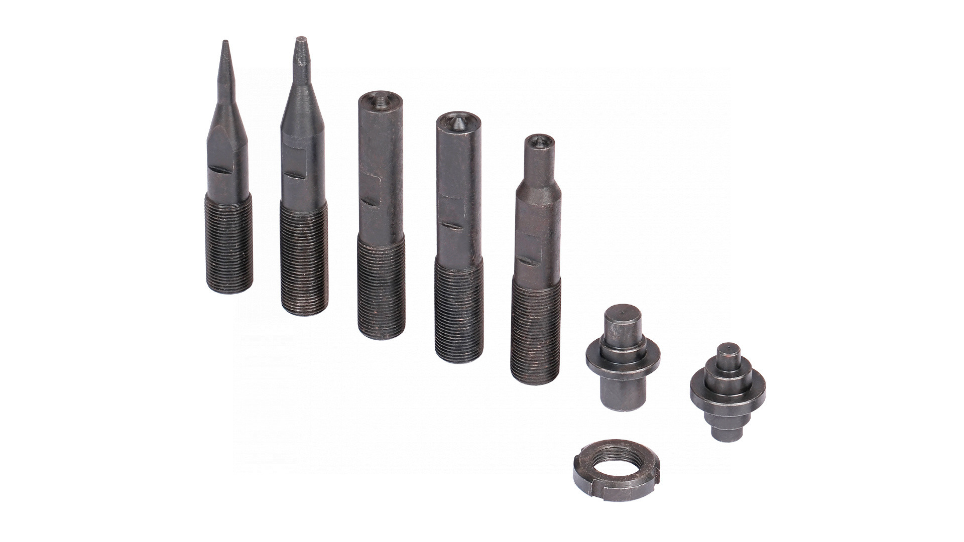 В комплекте прилагается полный набор пуансонов NR10PK для работы с разными рабочими диаметрами заклепок - до 10 мм.