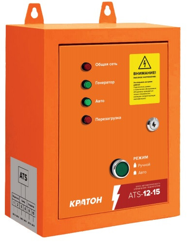 "Блок автоматического управления генератором Кратон ATS-12-15 предназначен для бензтновых генераторов до 15 кВт/230 В. Обеспечивает бесперебойную подачу электричества на объект. При падении напряжения в сети блок АВР запускает генератор, при появлении отключает. Рабочий диапазон температур от +5°C до +40°C. Комплектуется кабелем для подключения к электростанции. Выходные характеристики переменного тока, вырабатываемого генератором: Max мощность, 15кВт Максимальный ток 50 А Частота переменного тока 50 Гц Номинальное напряжение в сети 220 В±10 % Диапазон рабочих температур, 5-40°С Габариты, 250х140х380мм Наименование моделей бензиновых генераторов «Кратон» предназначенных для совместной эксплуатации с блоком автоматического управления генератором Крато ATS-12-15 GG-7500-EM-ATS GG-11000-E-ATS"