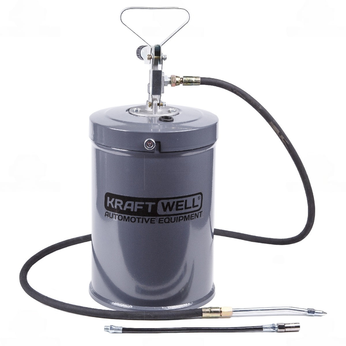 Нагнетатель солидола с ручным приводом KRW1797A представляет из себя стальную емкость объемом 10 литров с рычагом, воздействуя на который создается давление, необходимое для нагнетания густой смазки. Благодаря небольшим габаритам и рукоятке в верхней части обеспечивается мобильность и удобство использования нагнетателя в удаленных от станции техобслуживания местах. Для этого его заранее заправляют необходимым количеством смазки.