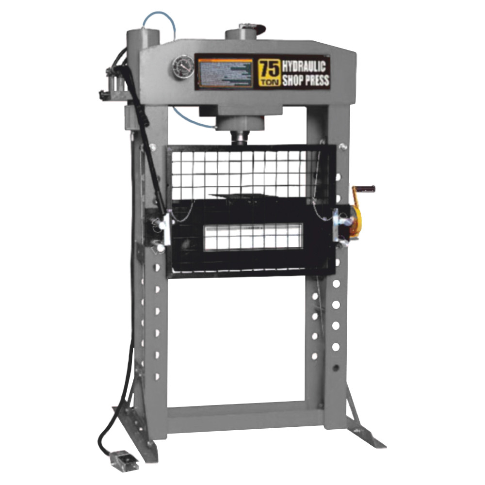 Напольный пневмогидравлический пресс WiederKraft WDK-80175, который обеспечивает усилие в 75000 кг. Используется в промышленности, автосервисах и СТО для запрессовки и выпрессовки деталей. Пресс оснащен с педалью для управления пневмоприводом. Привод представляет собой гидравлический цилиндр. В основе пресса разборная рамная конструкция из стоек, станин, верхней и нижней балок. Решетка обеспечивает защиту оператора во время выполнения операций. Встроенный манометр позволяет визуально контролировать величину прикладываемого усилия. Детали, подвергаемые прессовке, могут иметь различные размеры, ограниченные по высоте и ширине размерами рабочего пространства пресса.