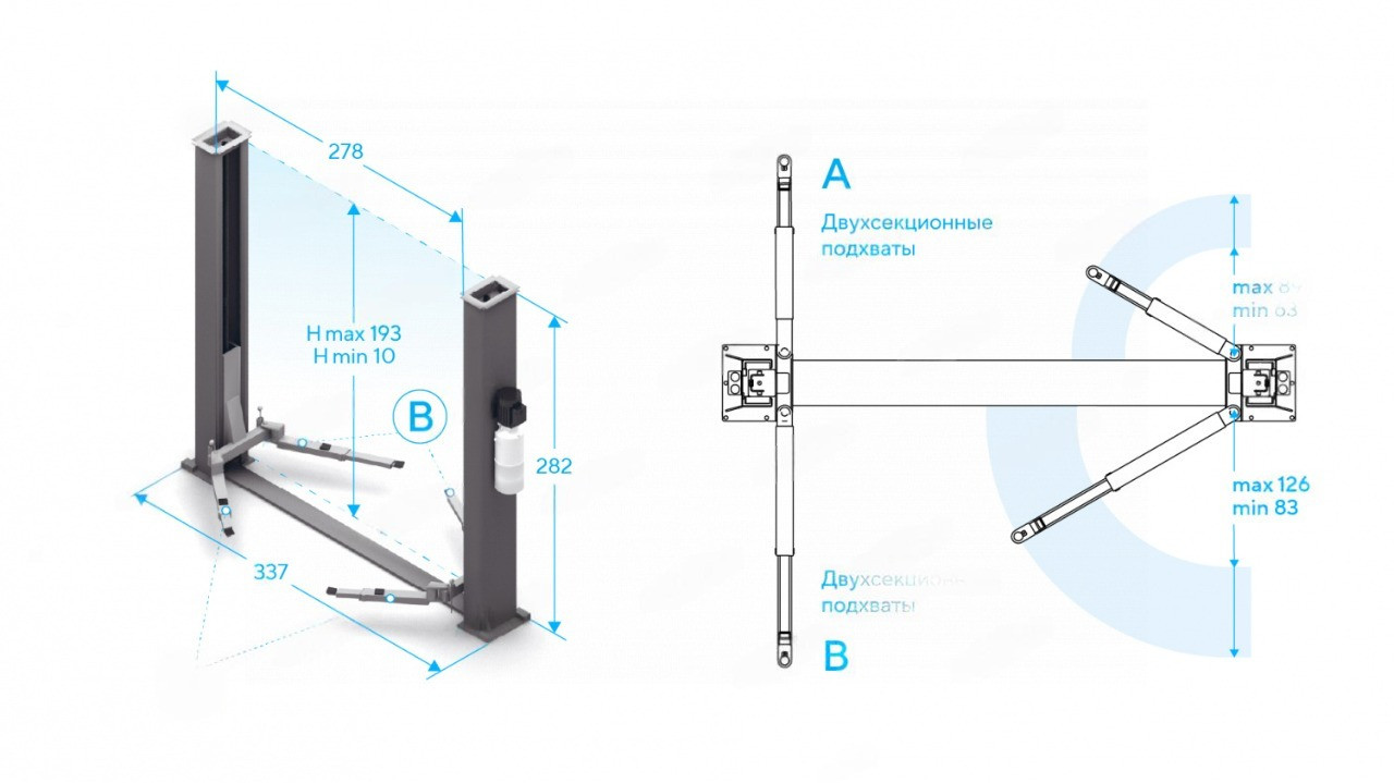 - Увеличенная высота подъёма 1800–1930 мм — обеспечивает удобный доступ к основным узлам при регулировочных, ремонтных и демонтажных работах;