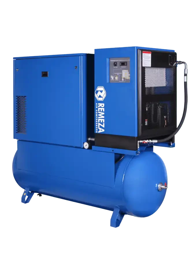 Оснащен горизонтально расположенным ресивером объемом 500 л и осушителем.