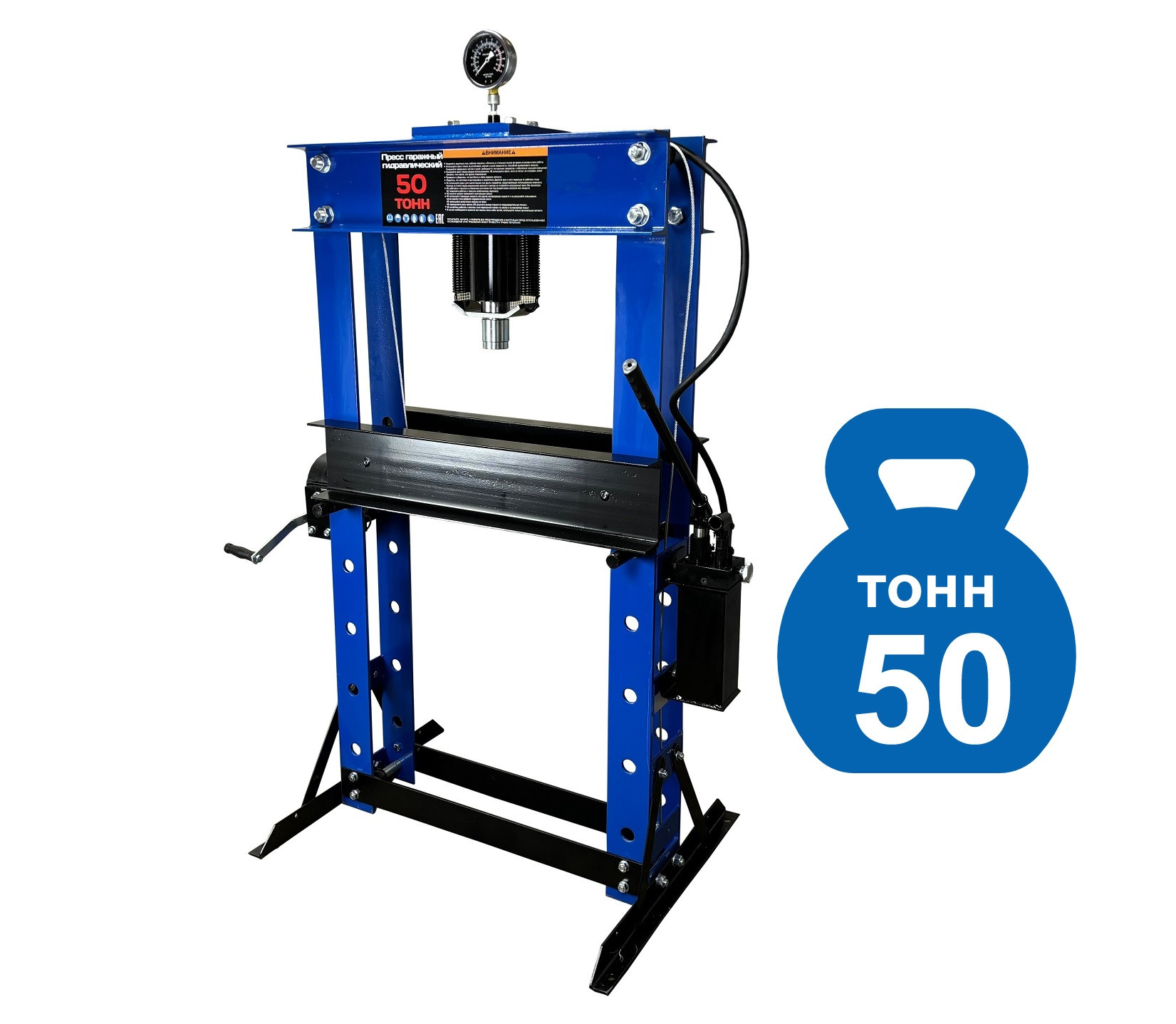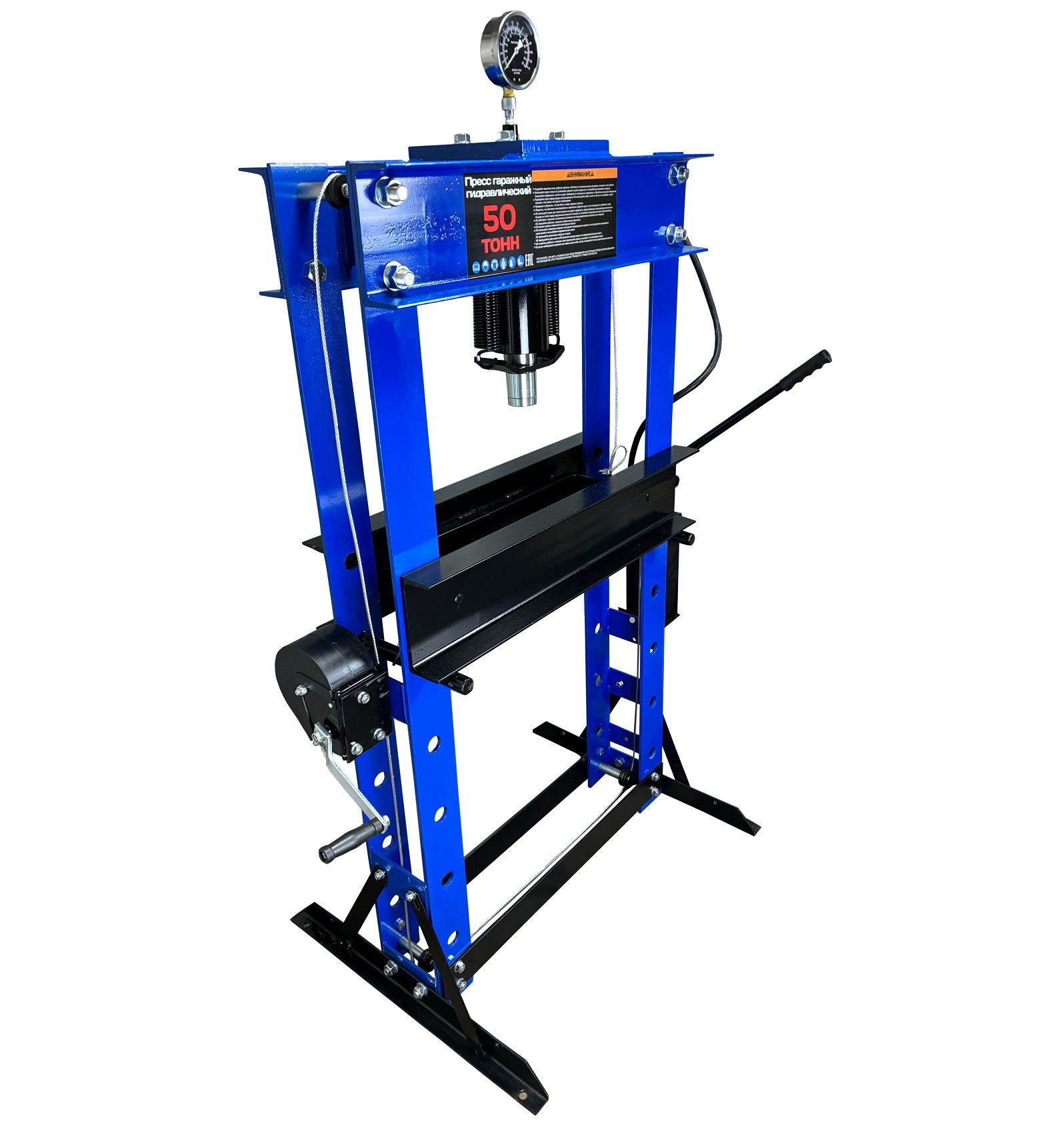 Привод ручной (2-е скорости. Подача пуансона к детали-быстро. Запрессовка-медленно. Усилие 50 т. Гидравлический. Двухскоростной насос. Ход поршня 230 мм. Рабочее окно 650х860 мм. Поршень приводится в действие нажатием на ручку. Две скорости подачи пуансона. Первая скорость для быстрой подачи штока к рабочей поверхности, вторая (медленно) для выпрессовки. Применяется для запрессовки деталей машин и механизмов в гаражах, автосервисах и СТО. Цвет синий. Доставка по РФ и ТС.