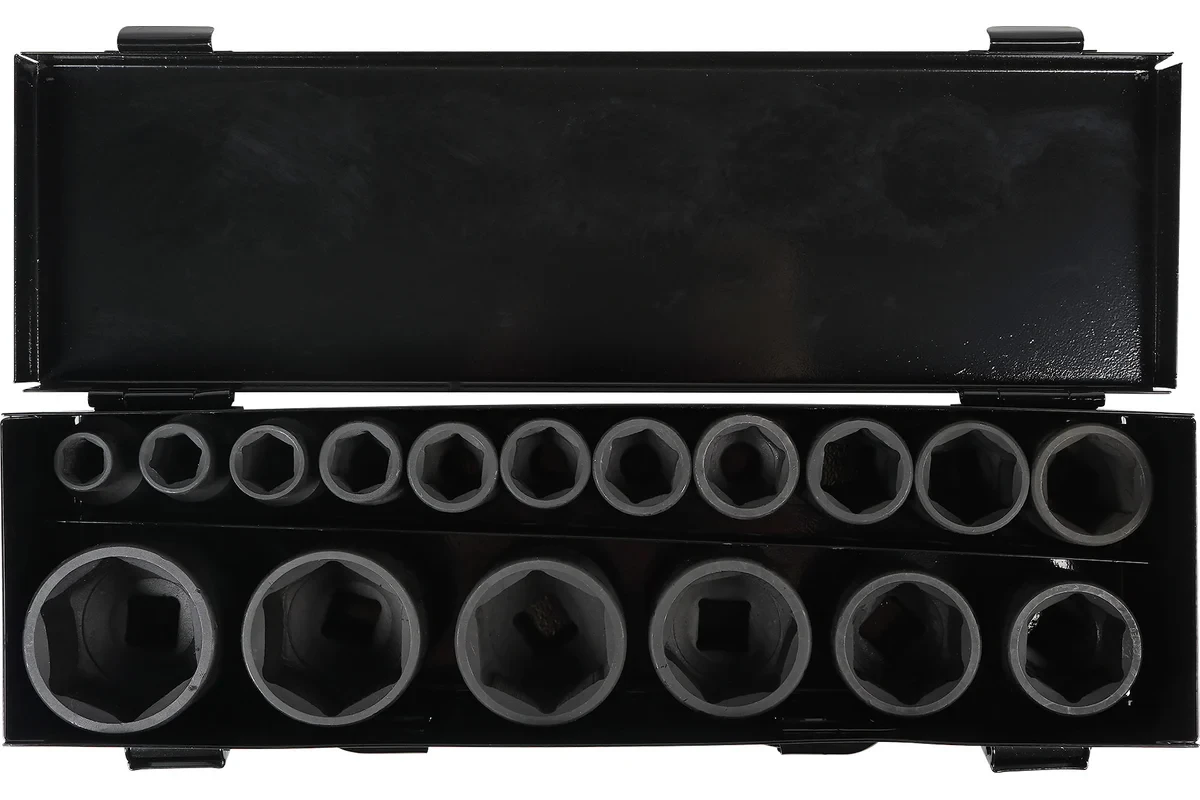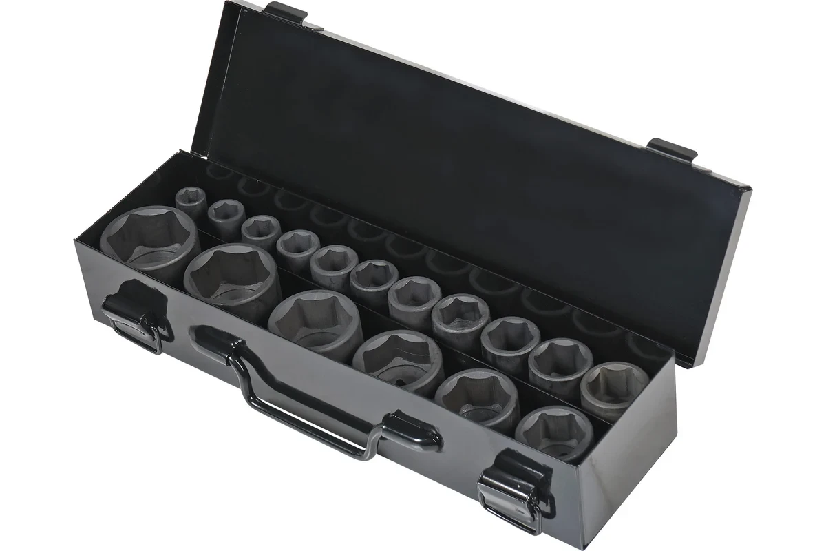 Набор головок шестигранных ударных применяется для монтажа/демонтажа крепежных элементов с помощью пневматического гайковерта. Предназначен для профессионального использования на СТО. Головки выполнены из специальной хром-молибденовой стали, что придает им высокую прочность и устойчивость к ударным нагрузкам. Комплект поставляется в металлическом кейсе.