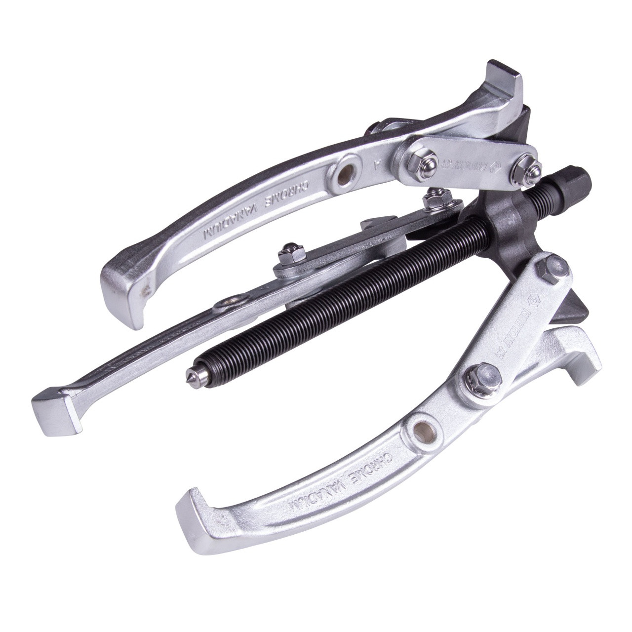 Демонтаж подшипников, шкивов и прочих деталей, запрессованных в обойму или установленных на вал. Применение съёмника помогает демонтировать деталь без перекоса и с соблюдением соосности.