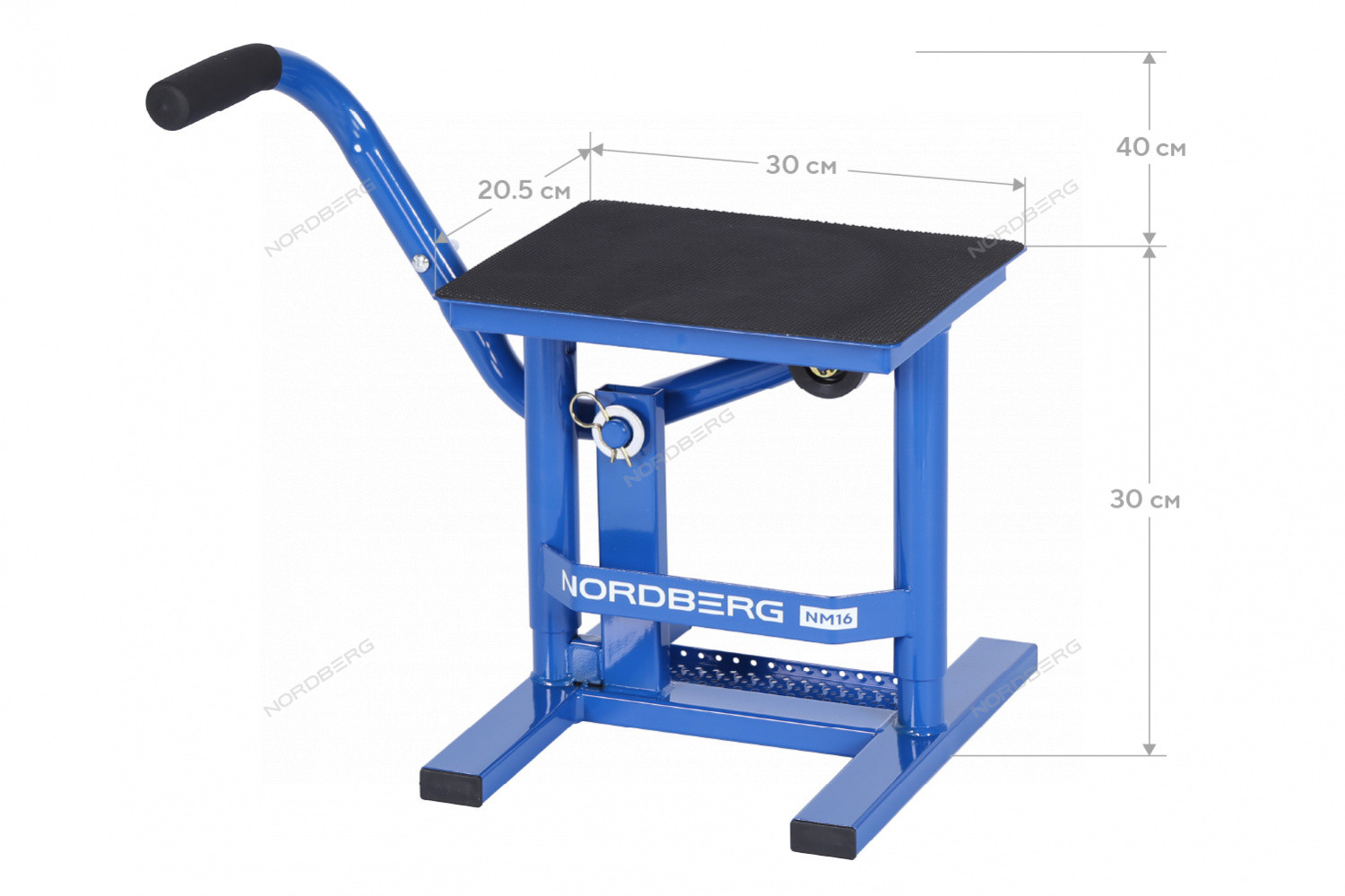 NORDBERG NM16 — компактная мотоподставка. Применяется в мотомастерских, гаражах и СТО для подъёма и фиксации мотоциклов и других двухколёсных транспортных средств.