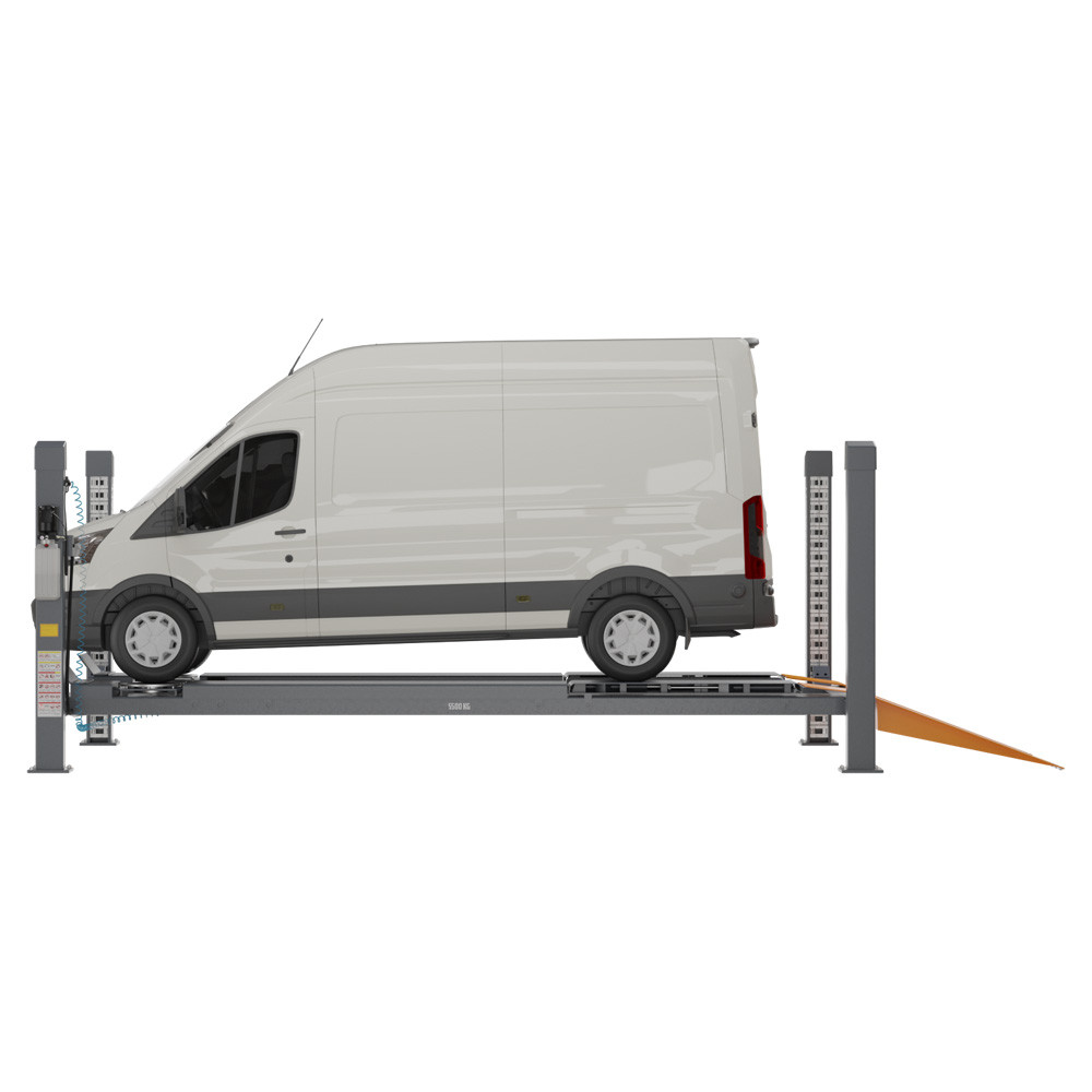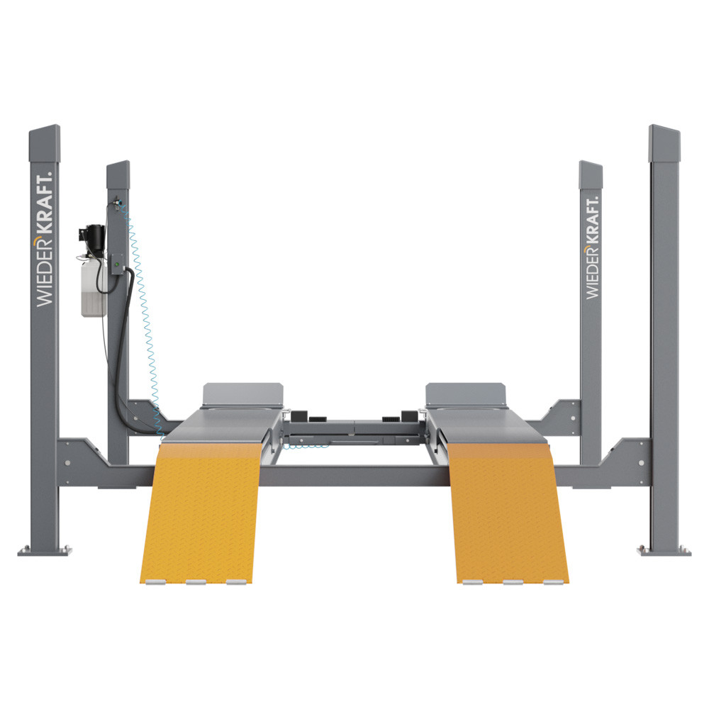 Четырехстоечный гидравлический подъёмник WiederKraft WDK-550 грузоподъемностью до 5500 кг. Применяется для регулировки развал-схождения и отличается высокой надежностью конструкции, наличием современной системой защиты от повреждения (кабеля при подъеме, от перегрузки по весу, от повреждения электропроводки). Подъемник модели WDK-550 оборудован двойным устройством безопасности: если замки безопасности у платформ не сработают, подъемник будет автоматически заблокирован дублирующим устройством. Пневматическое управление стопорами с центрального пульта и траверсой, изменяемое расстояние колеи, позволяет охватить широкий спектр задач и сделать подъемник универсальным. Эффективная длина подъемника составляет 5725 мм, что позволяет разместить на нем практически любой коммерческий транспорт. Комплектация подъемника включает в себя траверсу грузоподъемностью 2,7 тонны и задние сдвижные платформы для измерения геометрии и развал-схождения.