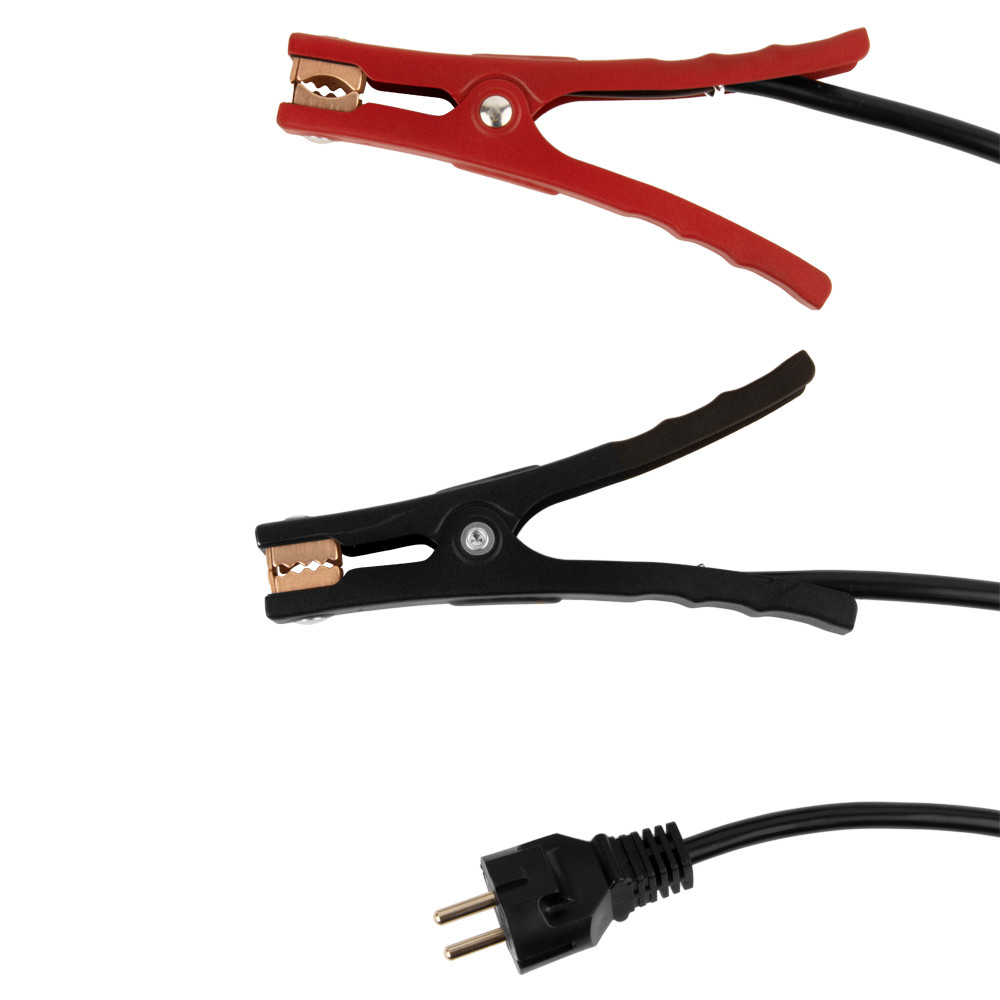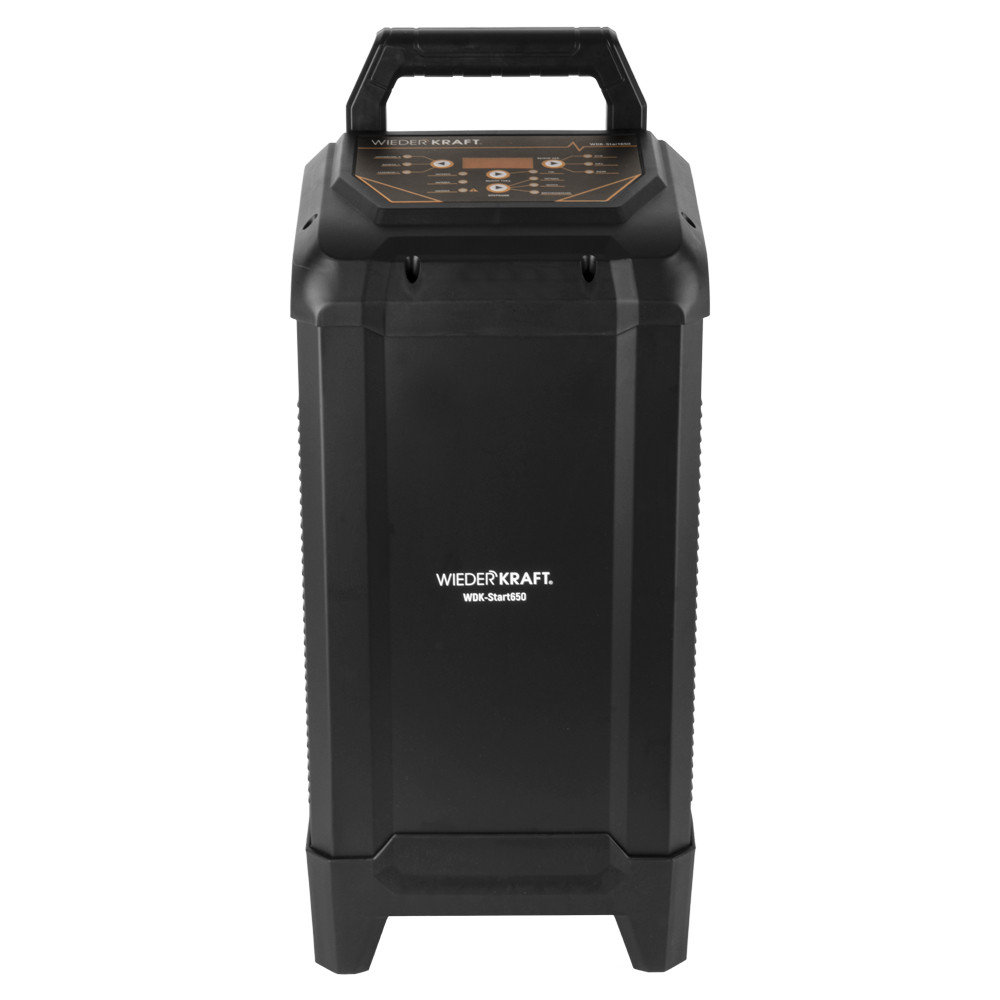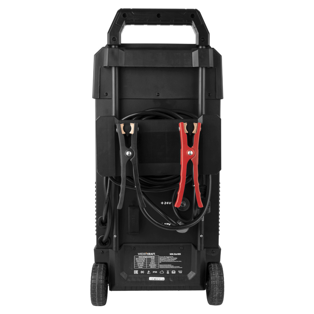 Мощное и многофункциональное пуско-зарядное устройство WiederKraft WDK-Start650, которое предназначенное для работы с аккумуляторными батареями напряжением 12 В и 24 В. Оно идеально подходит для запуска автомобилей, грузовиков, мотоциклов, лодок и другой техники, а также для зарядки и восстановления аккумуляторов различных типов. Устройство оснащено встроенным микропроцессором, обеспечивающим полный контроль за процессом зарядки АКБ без участия оператора. Во время зарядки ПЗУ 3 раза анализирует состояние подключенных устройств, проводит десульфатацию и абсорбцию – питание пульсирующими и постоянными токами. Затем идут этапы запуска контролируемого тока и постоянного напряжения. После них следует этап обслуживания – ПЗУ контролирует состояние АКБ и заряжает его струйным током при низком напряжении. Функция восстановления позволяет восстановить старые, неработающие, расслоенные или сульфатированные аккумуляторы (учитывайте, что не все АКБ могут быть восстановлены). Шесть степеней защиты обеспечивают максимальную безопасность устройства от короткого замыкания, обратной полярности, перезарядки, перегрузки по току, а также от искрообразования. Металлический корпус предотвращает механические повреждения внутренних компонентов устройства. Также корпус оснащается дополнительными вентиляционными отверстиями для защиты от перегрева. Два больших колеса по бокам и телескопическая ручка гарантируют легкое перемещение аппарата по рабочей площадке.