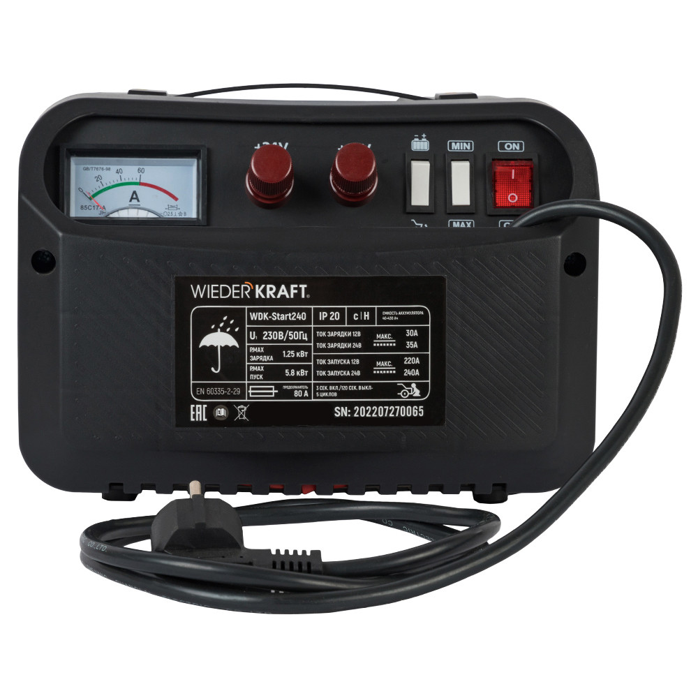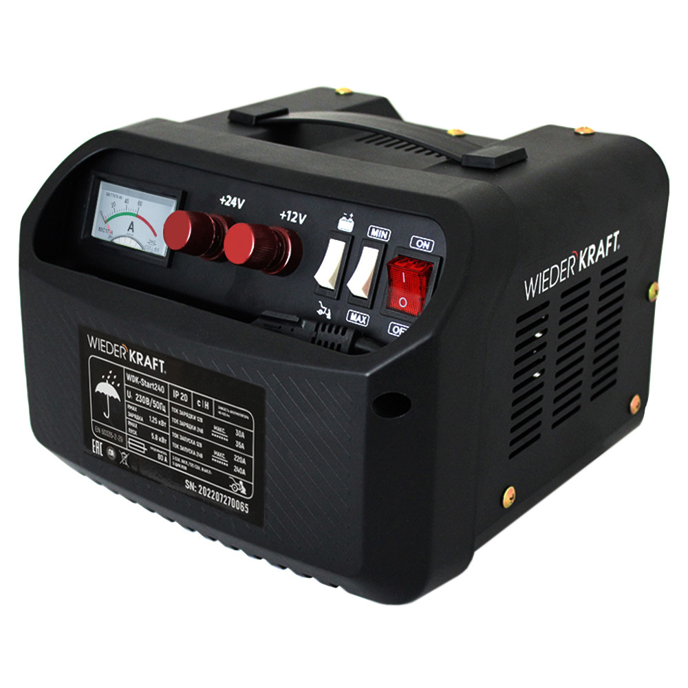Пуско-зарядное устройство WiederKraft WDK-Start240 — удобный прибор, позволяющий быстро зарядить аккумулятор или запустить технику. Устройство имеет возможность зарядки и запуска аккумуляторов 12/24 В. Паяные контакты и медный транcформатор обеспечивают высокую надежность ПЗУ. Подходит для работы с легковыми автомобилями, мотоциклами и лодками. Благодаря небольшим размерам и удобной рукоятке пусковое устройство применяется в небольших мастерских и гаражах. Его мощности достаточно для зарядки и запуска автомобиля в холодное время года. Пуско-зарядное устройство WDK-Start240 оснащено дополнительной секцией, в которой удобно хранить крокодилы. Корпус прибора имеет степень защиты IP20, и защищен от косвенного контакта с заземлителем. По всему корпусу расположена многочисленная перфорация, обеспечивающая эффективный отвод тепла от внутренних узлов. Лаконичный дизайн и небольшой вес обеспечивают удобство хранения и транспортировки.