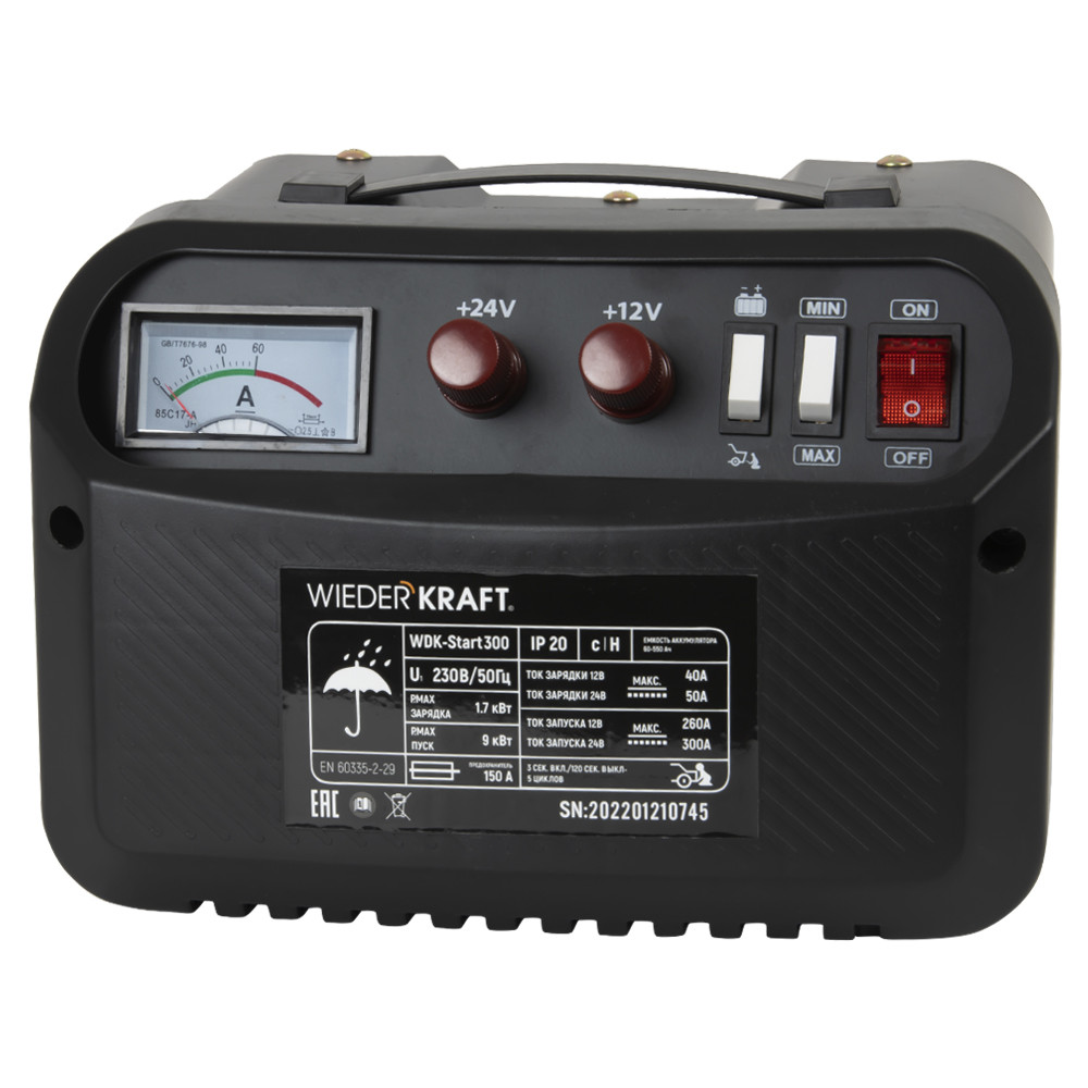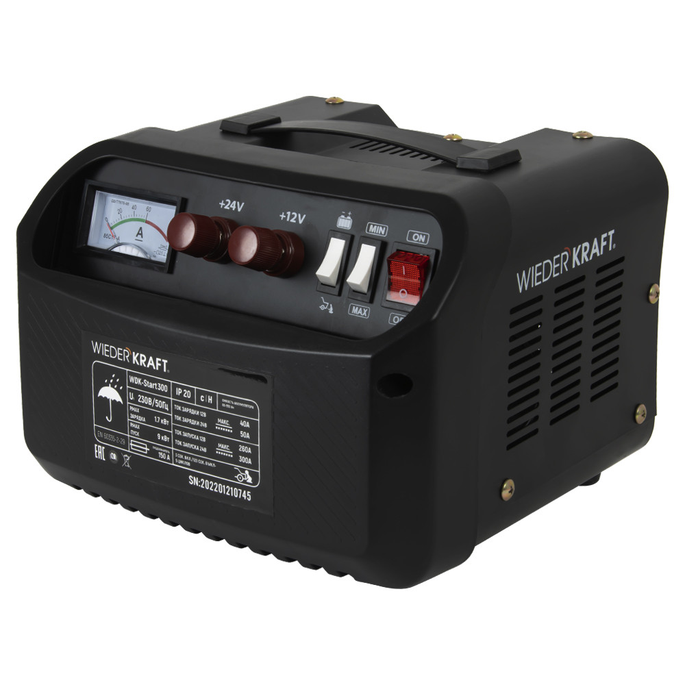 Пуско-зарядное устройство WiederKraft WDK-Start300 — удобный прибор, позволяющий быстро зарядить аккумулятор или запустить технику. Устройство имеет возможность зарядки и запуска аккумуляторов 12/24 В. Паяные контакты и медный транcформатор обеспечивают высокую надежность ПЗУ. Подходит для работы с легковыми автомобилями, мотоциклами и лодками. Благодаря небольшим размерам и удобной рукоятке пусковое устройство применяется в небольших мастерских и гаражах. Его мощности достаточно для зарядки и запуска автомобиля в холодное время года. Пуско-зарядное устройство WDK-Start300 оснащено дополнительной секцией, в которой удобно хранить крокодилы. Корпус прибора имеет степень защиты IP20, и защищен от косвенного контакта с заземлителем. По всему корпусу расположена многочисленная перфорация, обеспечивающая эффективный отвод тепла от внутренних узлов. Лаконичный дизайн и небольшой вес обеспечивают удобство хранения и транспортировки.