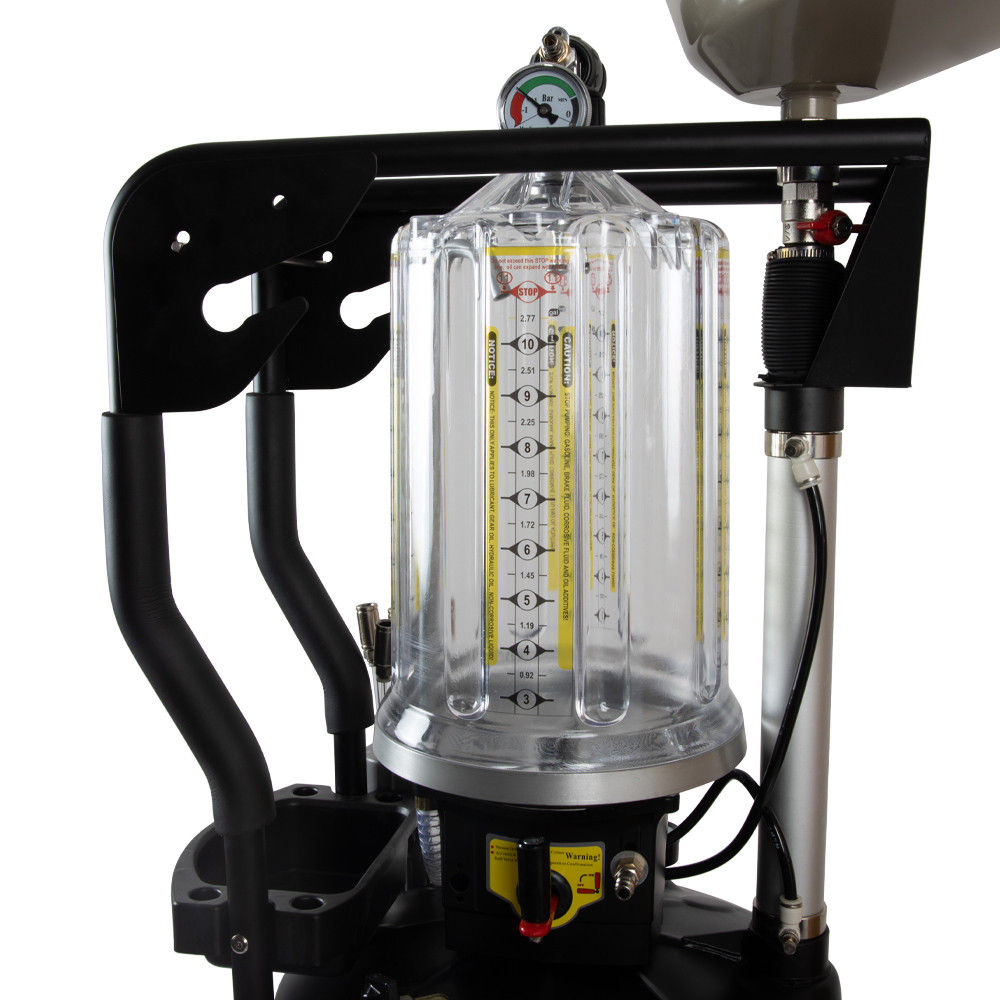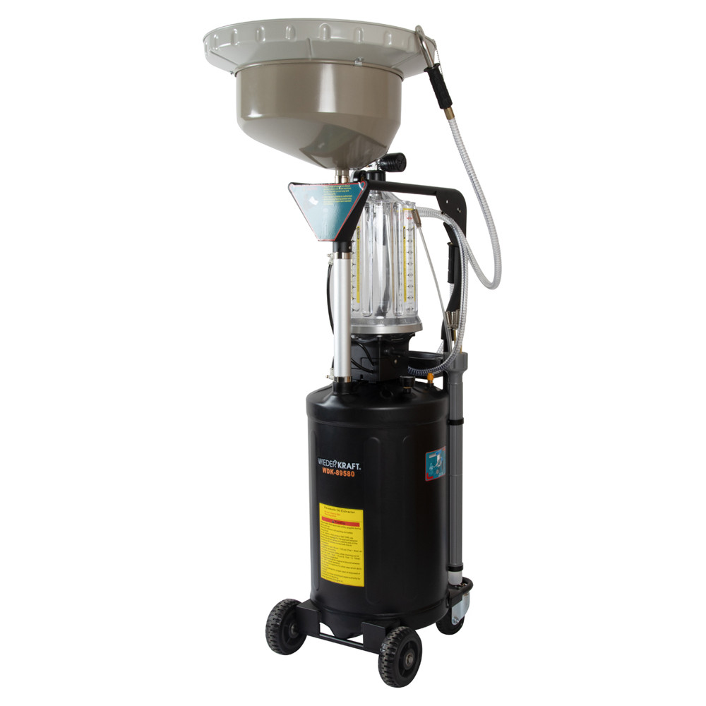 Установка для откачки и слива масла WiederKraft WDK-89580 с предкамерой, увеличенной воронкой, пневматическим регулированием высоты и баком на 75 литров. Предназначена для удаления отработанного масла и других жидкостей из любого транспортного средства при помощи внутри-вакуумной вытяжной системы или свободным сливом. Используется как сливное устройство со свободным сливом отработанного масла из двигателей, коробок передач и дифференциалов всех транспортных средств. Применяется для обслуживания любых видов двигателей внутреннего сгорания. Установка мобильна и проста в эксплуатации. Включает шесть гибких щупов для извлечения жидкости через отверстие щупа контроля уровня масла автомобиля. Установка снабжена специальным лотком для хранения инструмента и деталей. Регулируемая воронка для сбора масла может быть установлена на необходимой для работы высоте (от 1205 до 1805 мм). Оборудование укомплектовано краном в воронке для сбора масла, для контроля состояния сливаемого масла перед началом слива в резервуар. Возможность самоочистки делает работу с устройством чистой и легкой. Осмотровая колба позволяет визуально оценить качество отработанного масла, имеющиеся недостатки двигателя.