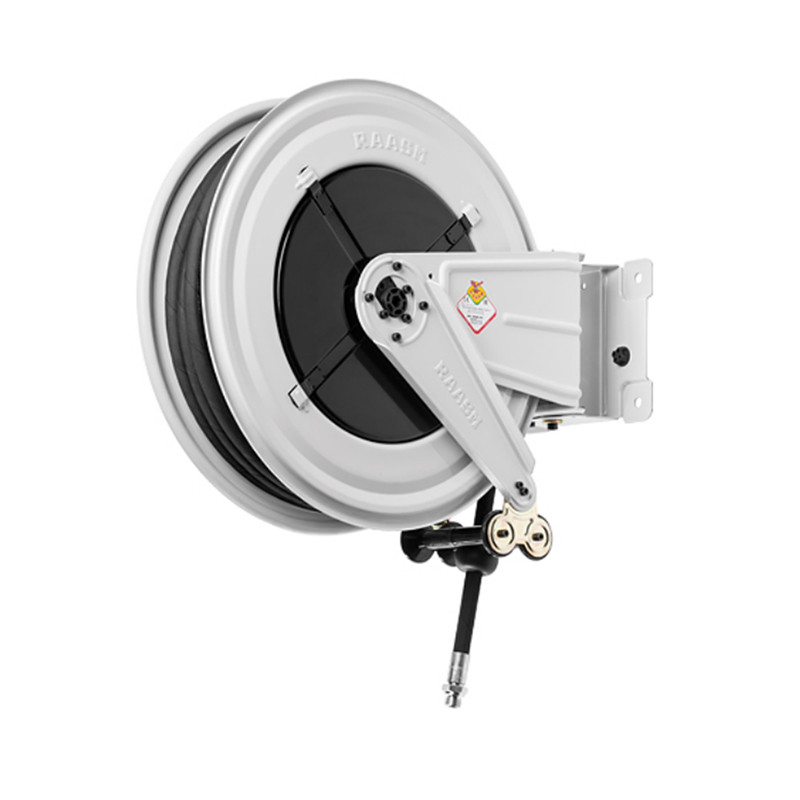 Катушка со шлангом RAASM 8520.101 для воздуха и воды поворотная открытая, представляет собой простую конструкцию с бобиной, кронштейном и основанием для крепления на стену, пол или потолок. Поворотная опора быстрого действия делает более удобной установку раздаточной катушки и позволяет получить поворот в 55˚ вправо или влево или в неподвижное положение в 0˚ при помощи блокировки двумя болтами. Устройство укомплектовано шлангом из черной синтетической резины длиной 20 м и диаметром 1/2''. Шарнирное соединение и фитинги выполнены из нержавеющей стали AISI 304. Для подключения конструкции к водопроводной или воздушной магистрали используются штуцеры с наружной резьбой на входе F1/2''G, на выходе M1/2''G. Корпус и крепление катушки изготовлены из окрашенной стали, исполнения ABS, устойчивой к ударам и коррозии. Прокладки из Viton.