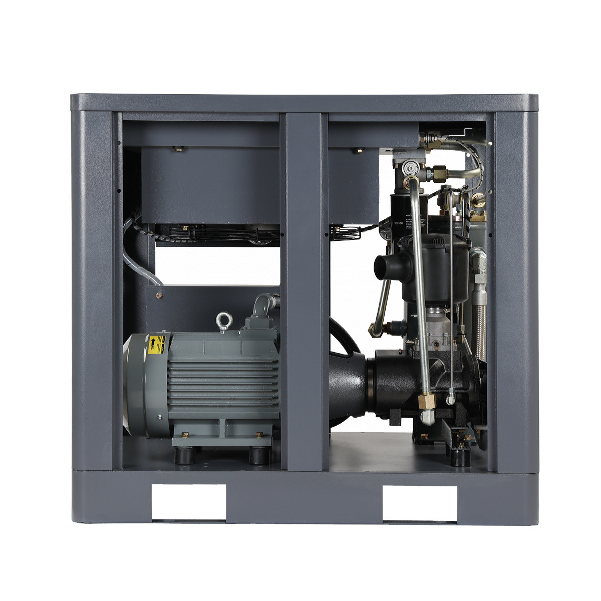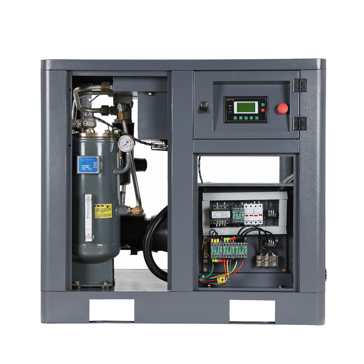 Винтовой компрессор с впрыском масла и приводом от электродвигателя используется для выработки сжатого воздуха при использовании пневмоинструмента и оборудования.