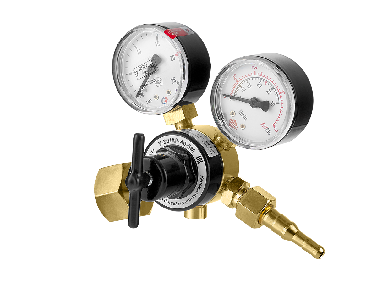 Регулятор расхода газа У—30/АР—40—5М с поверенным манометром — малогабаритная модель в прочном алюминиевом корпусе, предназначенная для понижения давления газа, поступающего из баллона, и автоматического поддержания постоянного заданного рабочего расхода газа при питании постов и установок в среде защитных газов (углекислый газ, аргон), а также в смежных технологических процессах. Класс точности расходомера 10, Класс точности манометра 2,5.