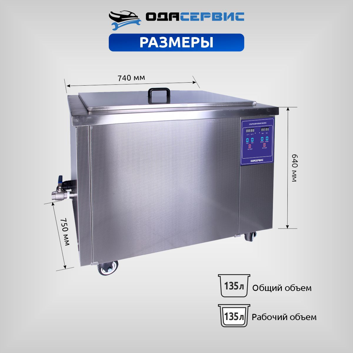 ОДА Сервис ODA-LQ1350 — это промышленная ультразвуковая ванна на 135 литров с регулировкой мощности ультразвука, электронным таймером и подогревом. Такие ванны имеют широкий спектр применения, от мойки крупных и не очень деталей в автосервисе, до использования на производстве.