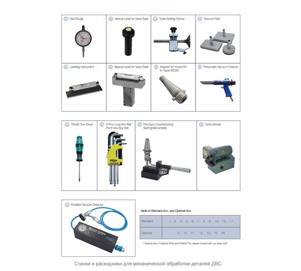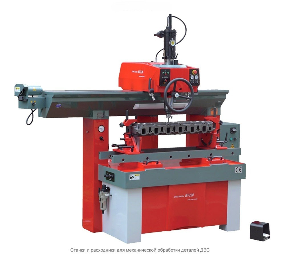 Станок предназначен для обработки рабочей фаски седла клапана на ГБЦ как с наклонной, так и с вертикальной осью стержня клапана, а именно подавляющее большинство ГБЦ наземного и водного транспорта. Подходит для обработки седел как в чугунной ГБЦ, так и в ГБЦ из цветных сплавов. Благодаря встроенному в станок вакуум тестеру есть возможность проверить качество прилегания клапана к седлу не демонтируя ГБЦ со станка и не прибегая к сборке клапанов с последующим проливанием их керосином, что значительно ускоряет процесс выполнения работ. Данный тип станков проверен временем и зарекомендовал себя как надежный инструмент в крупном ремонтном цеху.