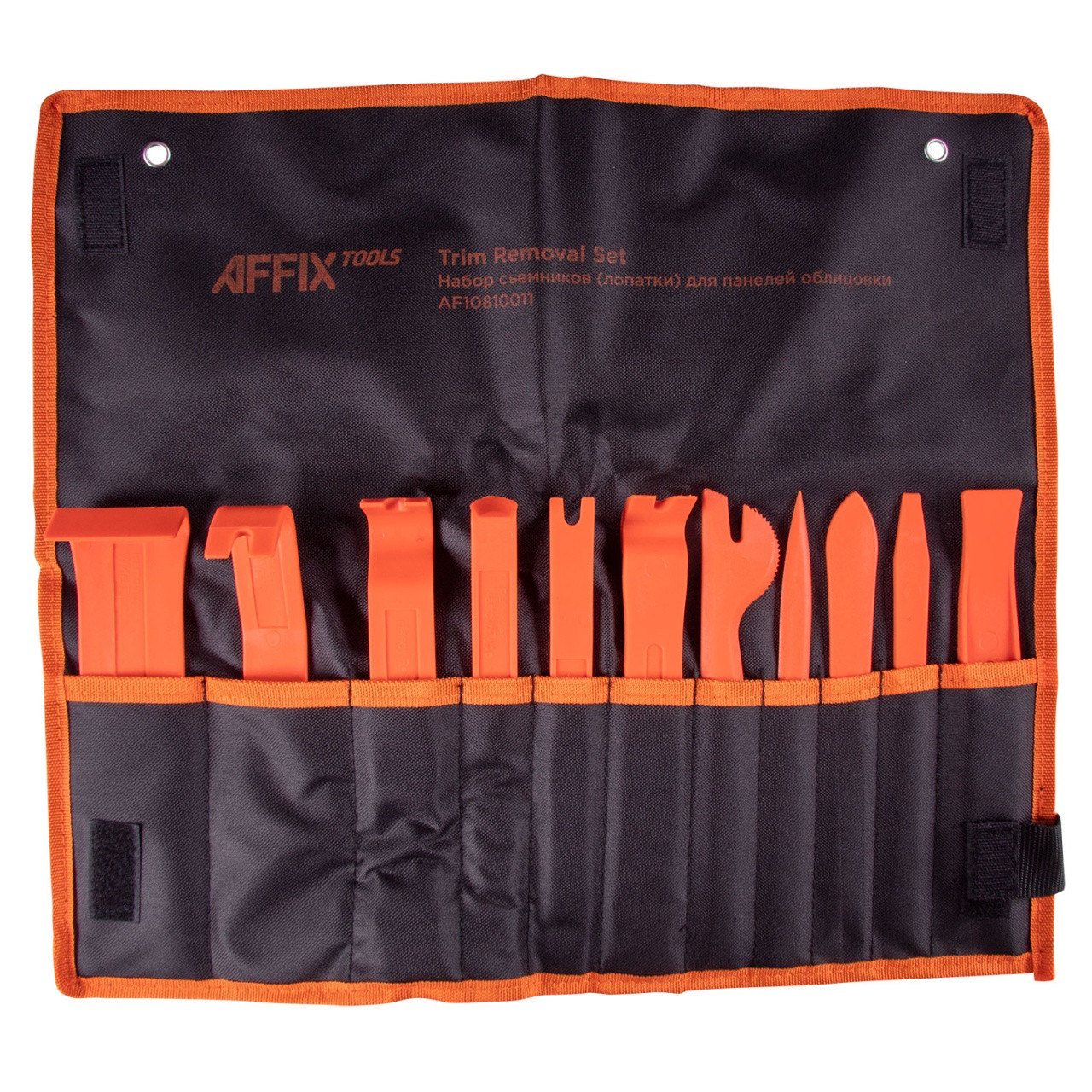 Инструменты изготовлены из полиамидного композита и расположены в чехле из капрона, каждый в своей ячейке, что даёт возможность контролировать целостность набора и содержать его в полном порядке, а люверсы в чехле будут удобны для вывешивания набора на рабочем месте, к примеру, стенде или верстаке.