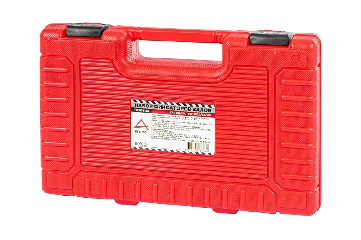 Профессиональный набор Arnezi R7702135 предназначен для точной установки фаз газораспределительного механизма на современных бензиновых двигателях VAG группы EA211 (1.0/1.2/1.4/1.6 л) серий FSI, TSI, TFSI. Комплект обеспечивает правильное позиционирование распредвалов и коленчатого вала при замене ремня ГРМ.