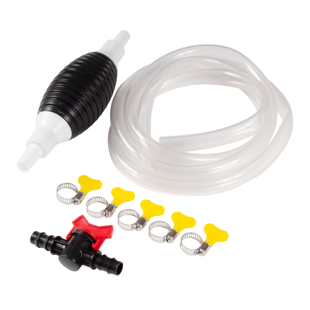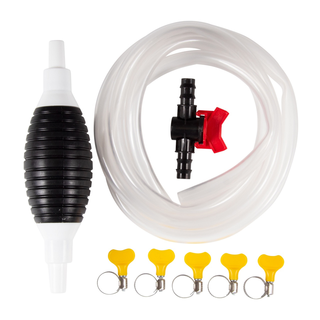 – Насос сифонный 220 мл – Шланг ПВХ 2 метра сечением 14×18 мм – Регулировочный клапан с вентилем – Комплект хомутов 5 шт.