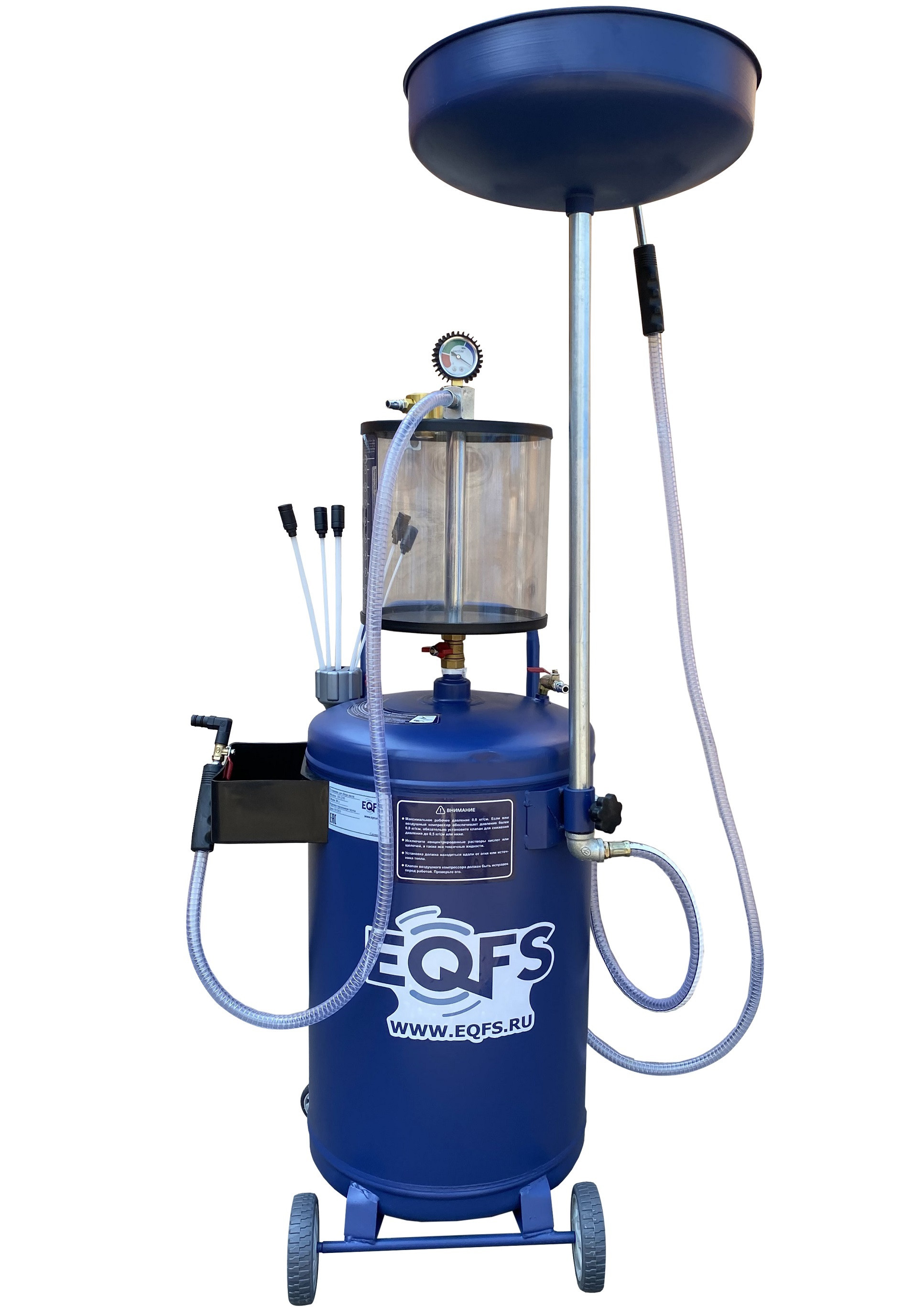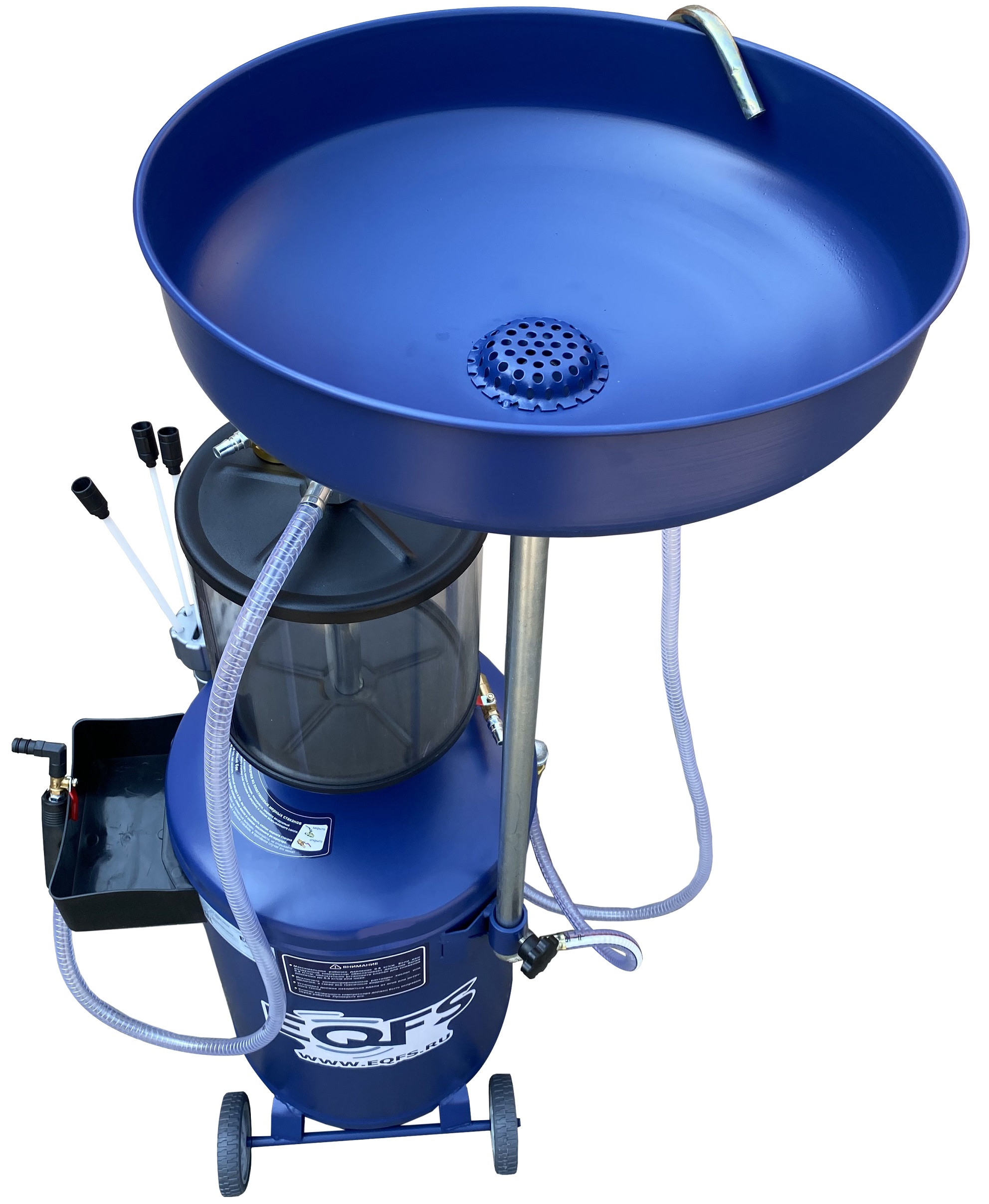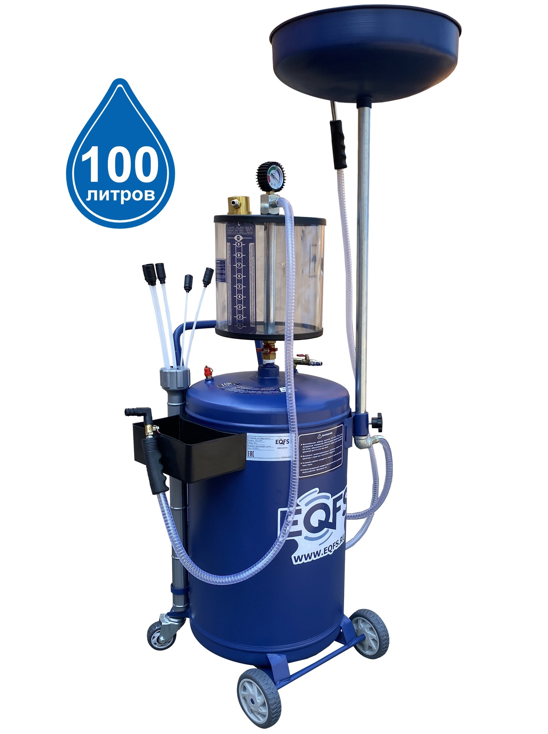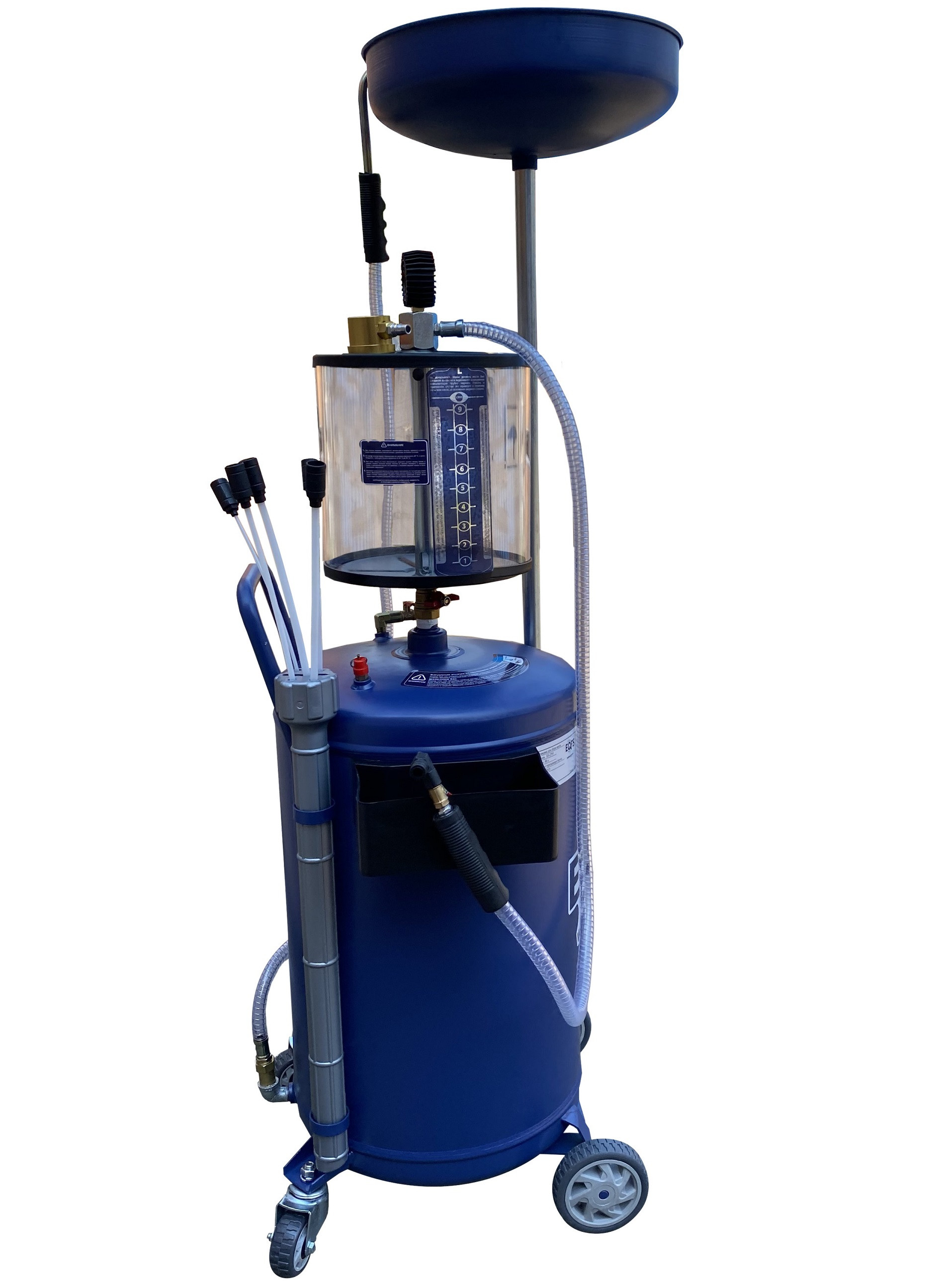 Установка для слива и откачки щупами масла и антифриза из ДВС, КПП и мостов всех авто. В комплекте: Колба + сливная чаша с сеткой для улавливания мелких деталей + щупы гибкие 5 шт. + лоток для сливной пробки + стрелочная индикация уровня разрежения + визуальный контроль уровня отработки + пистолеты для откачки масла + быстросъёмный штуцер для пневмолинии + сепаратор для выхода воздуха. Вмещает 100 л. = Бак 80л + колба 10 л. + сливная воронка 10л.