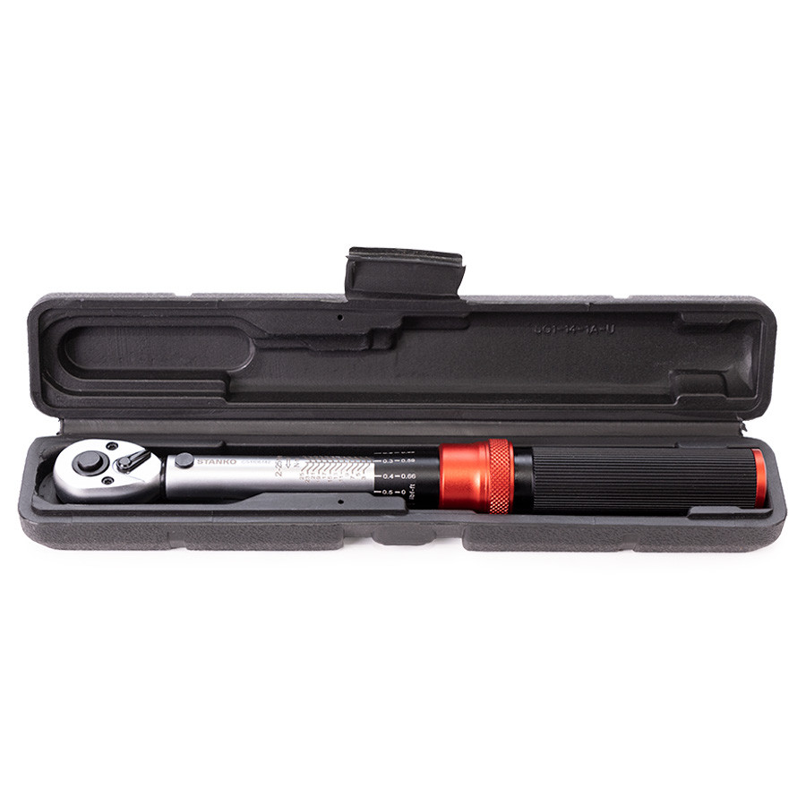 Инструмент изготовлен из качественной хромованадиевой стали, что придает ключу высокую прочность и точность измерений. Трещоточный механизм имеет 72 зуба, такое решение представляет собой оптимальный баланс комфорта работы, так как шаг перехвахвата всего 5 градусов и прочности, за счет большого пятна контакта в механизме. Наличие механизма быстрого сброса, обеспечивает надежное удержание оснастки на посадочном квадрате и легкий ее демонтаж. Рукоятка изготовлена из алюминиевого сплава и снабжена специальным рифлением для обеспечения надежного удержания в процессе работы. Фиксатор пружинного типа обеспечивает простоту настройки нужного момента и надежную фиксацию. Ключ поставляется в пластиковом ударостойком кейсе.