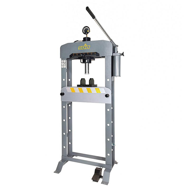 SP-30EAM, Пресс гидравлический напольный, 30 тонн, SNIT. Прочная сварная конструкция рамы. Гидравлическая система промышленного уровня. Двухскоростной насос обеспечивает стабильность работы пресса. Шток гидроцилиндра хромирован для защиты от задиров и коррозии. Цилиндр может смещаться по горизонтали в диапазоне 120 мм в каждую сторону, а рабочий стол регулируется по высоте на 990 мм, что значительно увеличивает функциональность пресса. Для легкого перемещения стола, пресс оснащен механической лебедкой. Двухскоростной насос быстро выдает необходимое давление пресса. Управление ручкой или педалью пневматического насоса. Шток гидроцилиндра хромирован для защиты от коррозии. Система авто возврата поршня. Встроенный клапан для защиты от перегрузок. V-образные призмы.
