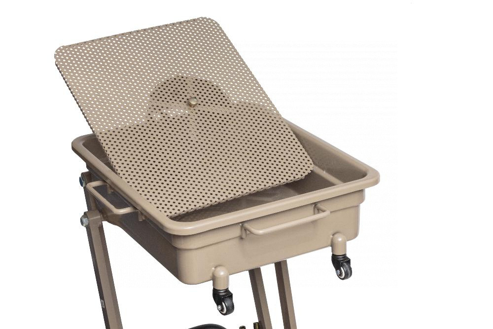 Подъёмный лоток легко закатывается под автомобиль благодаря наличию шасси. Лоток оснащена металлической сеткой и вмещает 30 л масла (до уровня сетки).