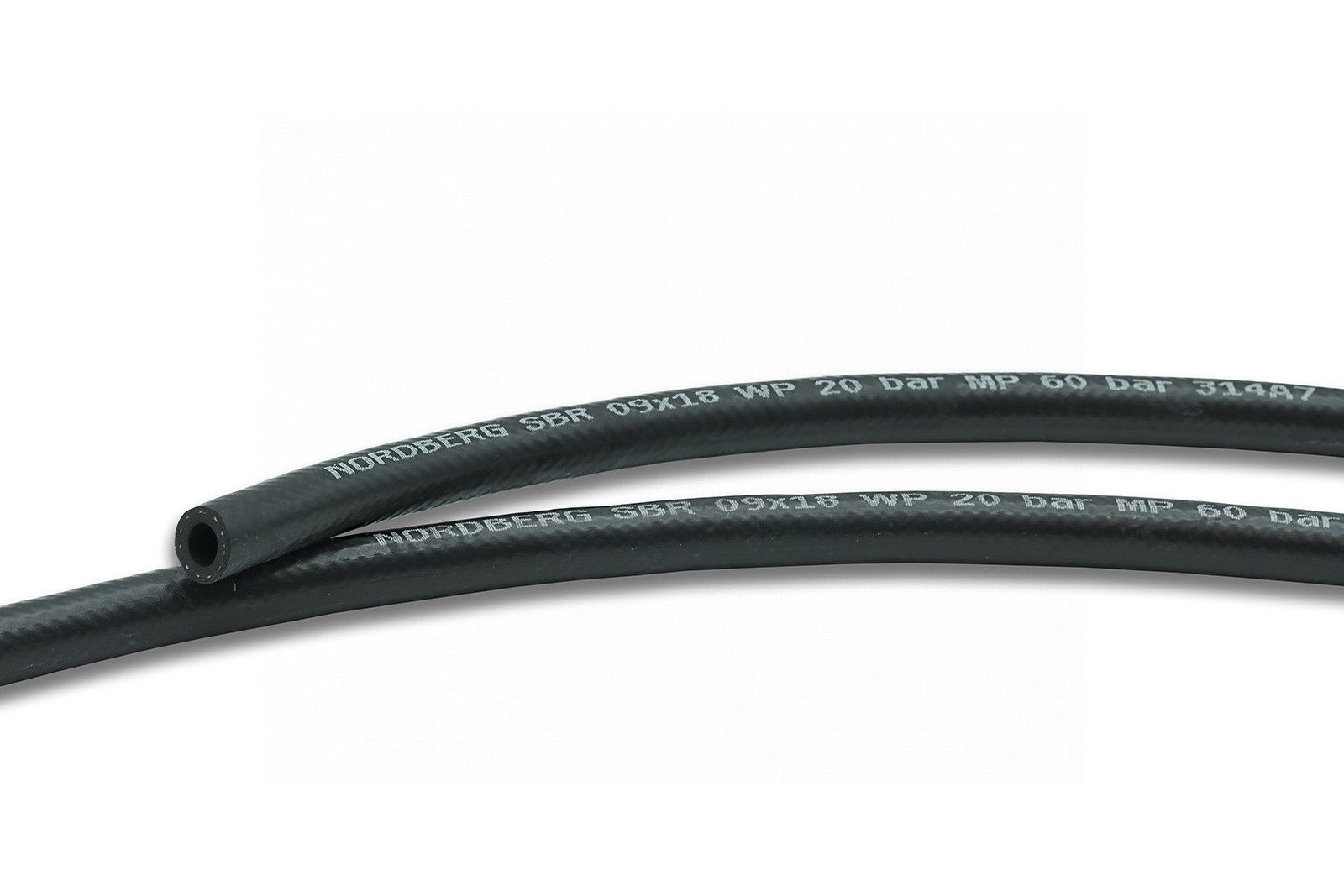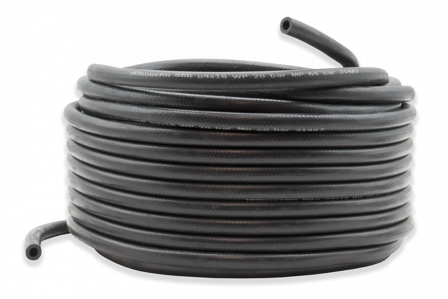 Шланг резиновый армированный SBR, 18x9 мм, 1м. NORDBERG H918SBR предназначен для подачи под давлением сжатого воздуха, инертных газов. Выдерживает давление до 60 бар и температуру от -35°C до + 70°C.