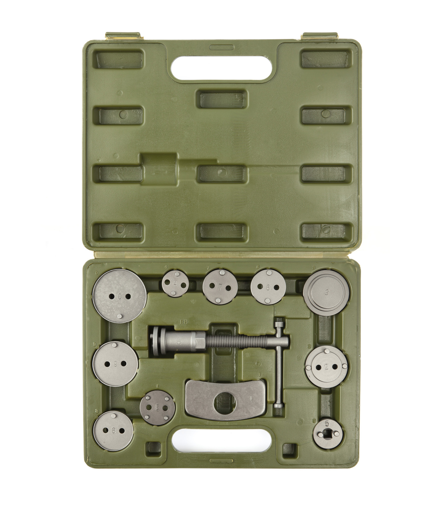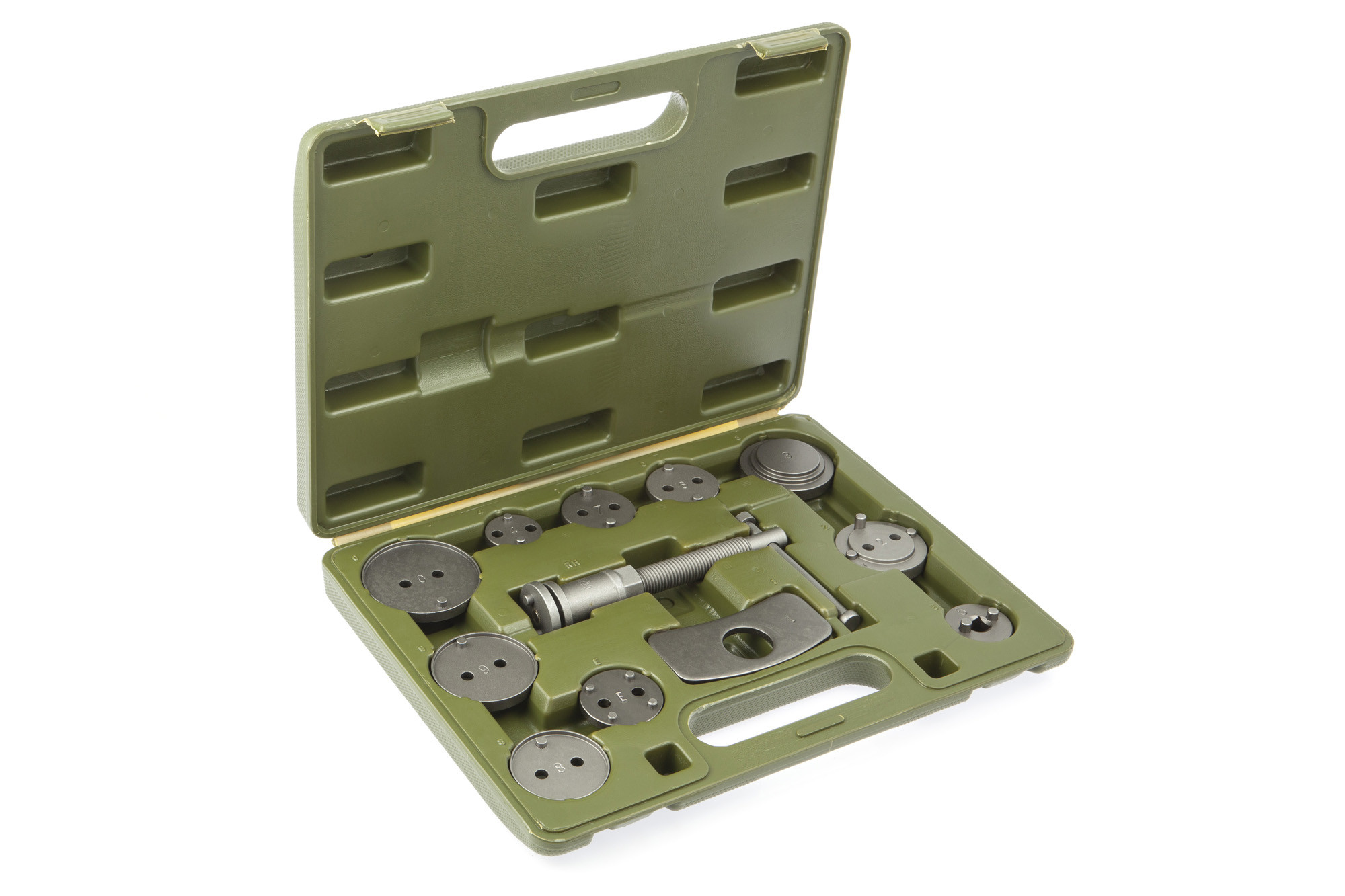 Состав набора: — Т-образная рукоятка с резьбой — насадки — 8 шт. — планка-упор — насадка для утапливания поршней без вращения — насадка-адаптер под вороток 3/8" для совмещения пазов на поршне и тормозных накладках — пластиковый кейс